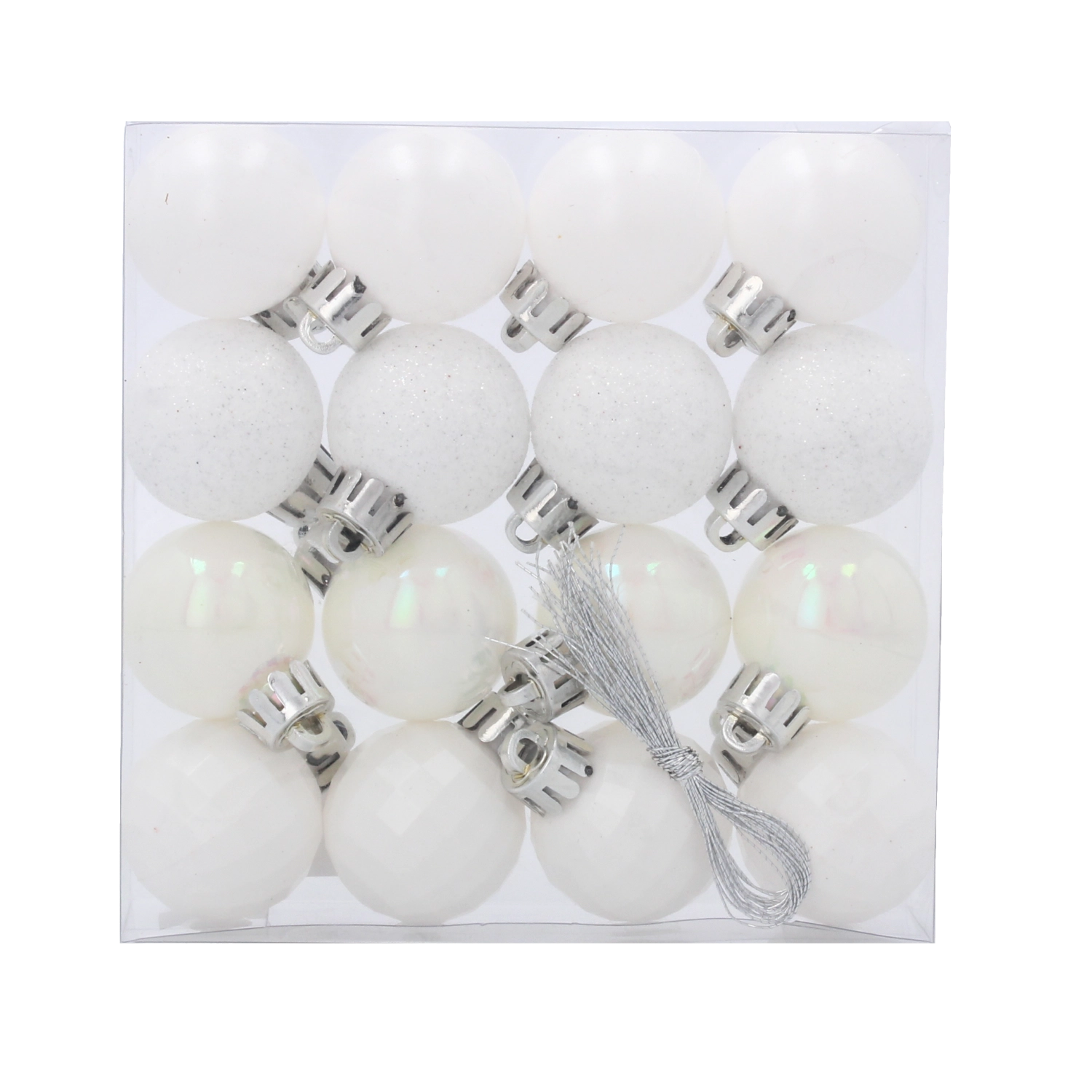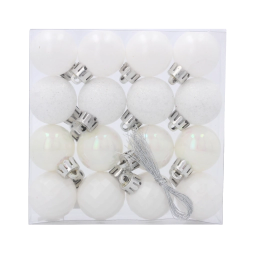 Giv dit juletræ tidløs charme med et sæt på 16 hvide juleornamenter med en diameter på 3 cm. Kombinationen af matte, blanke, glitrende og disco effekter skaber en harmonisk helhed og et elegant udtryk. Ornamenterne er ubrudsikre, lavet af holdbar plast og udstyret med snore for nem ophængning, så de er ideelle i hjem med børn og kæledyr.