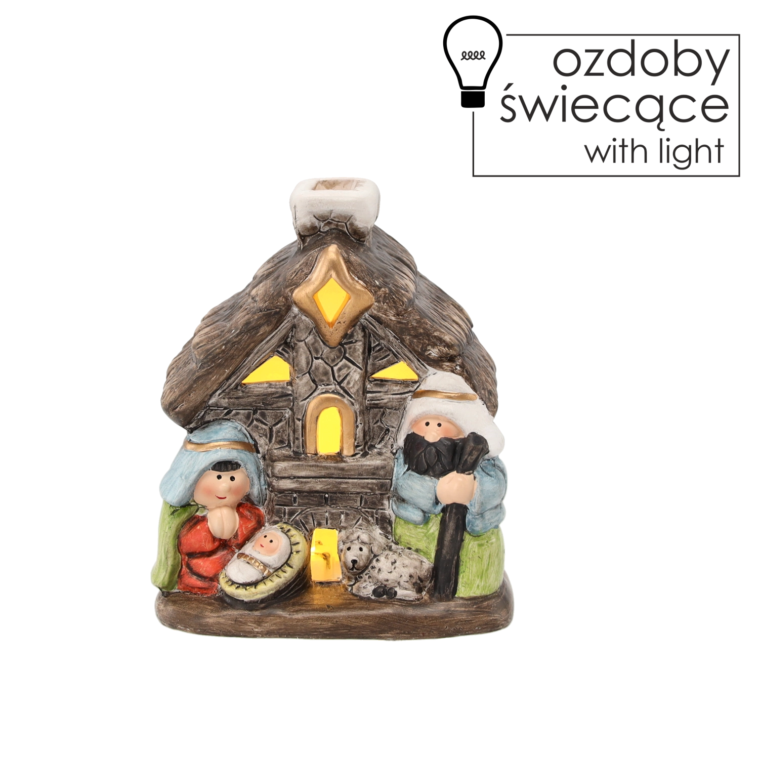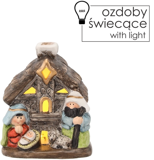 Denne charmerende krybbe i form af et stenhus viser den hellige familie med fine detaljer, inklusive et lille får, som understreger den rolige og traditionelle atmosfære. Integreret LED-baggrundsbelysning giver dekorationen en varm glød og forvandler hylden, kommoden eller det festlige bord til et hyggeligt sted.