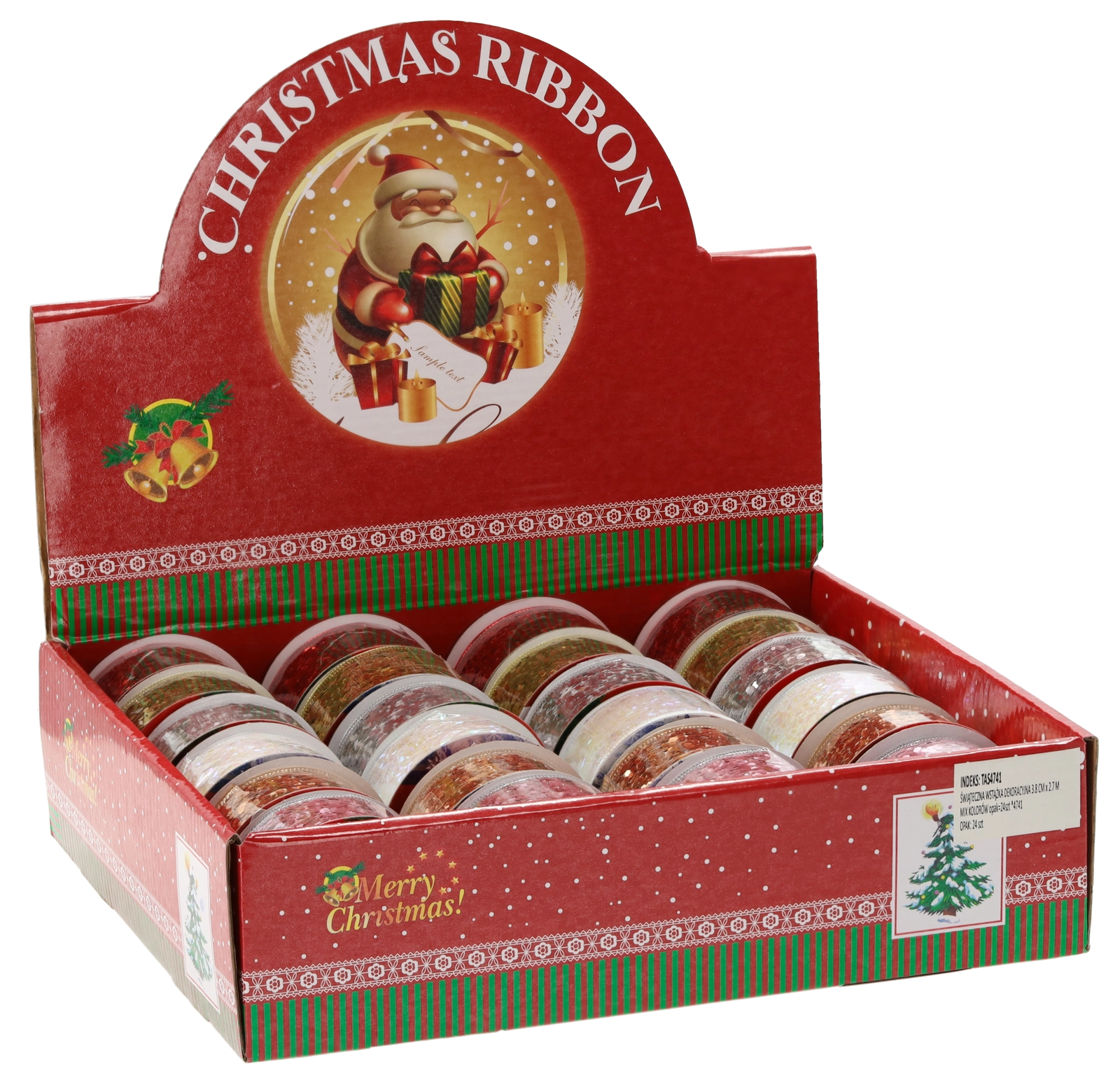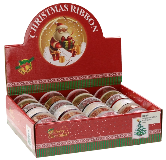 Elegant julebånd med en bredde på 3,8 cm og en længde på 2,7 m, som giver dine dekorationer og gaver en festlig glans og et professionelt udseende. Takket være et mix af farver og mønstre kan det nemt matches med resten af pynten, og den kvalitetsrige polyester sikrer styrke og holdbarhed ved formning af sløjfer og arrangementer.