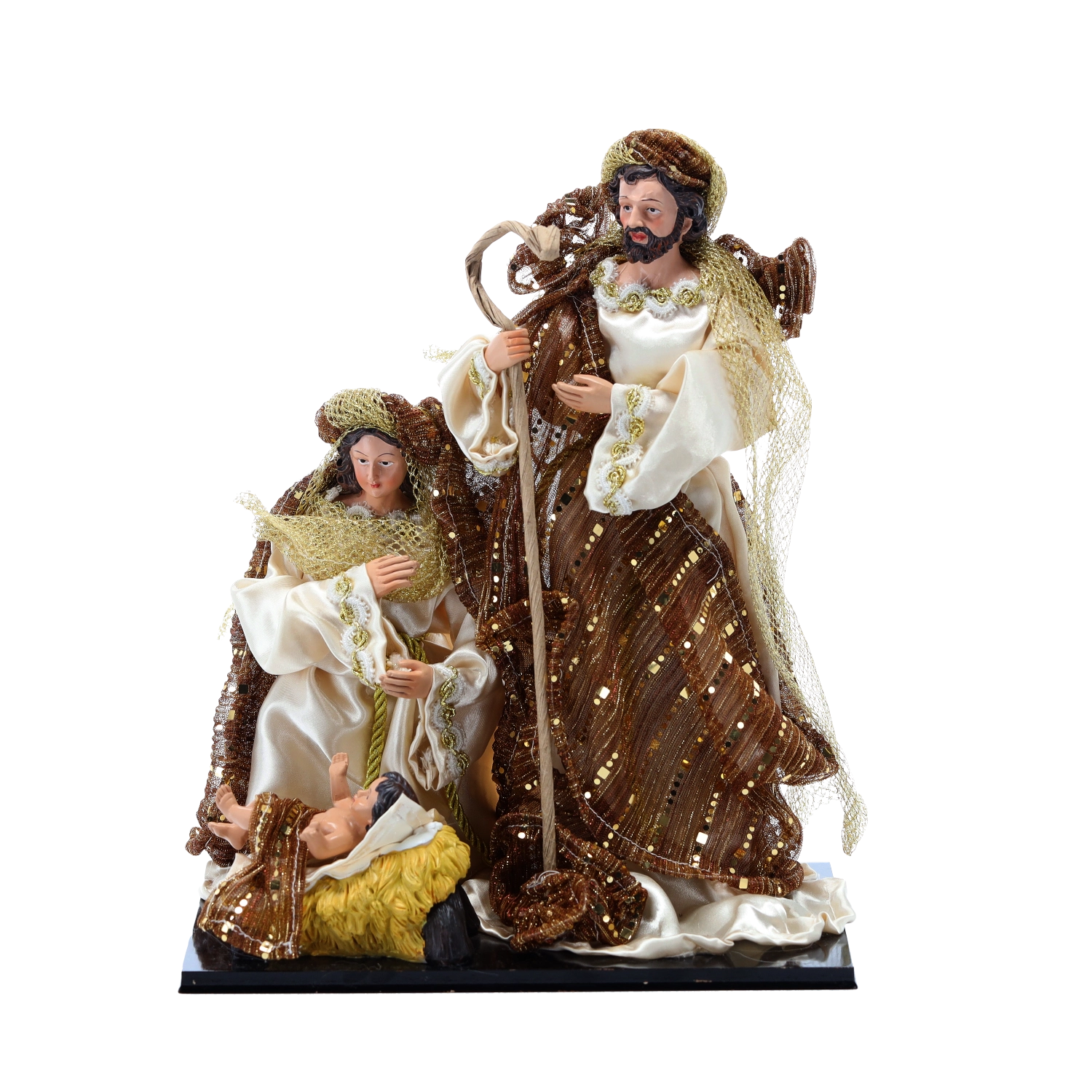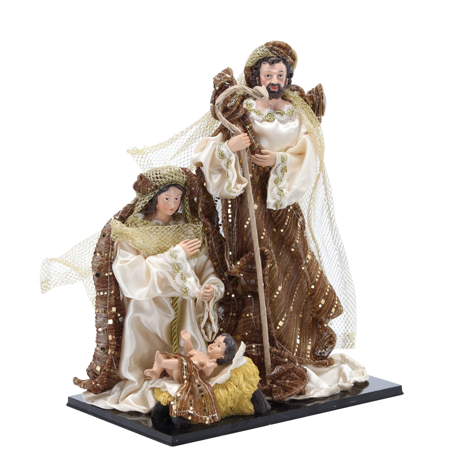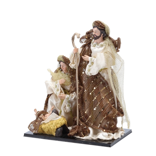 Denne figur af Den hellige familie bringer varme, ro og traditionel julesymbolik ind i hjemmet. Figurerne er udført med fokus på realistiske udtryk og tekstur i klæderne, hvilket gør dem særligt imponerende og repræsentative. En stabil sokkel sikrer sikker placering på enhver plan overflade.