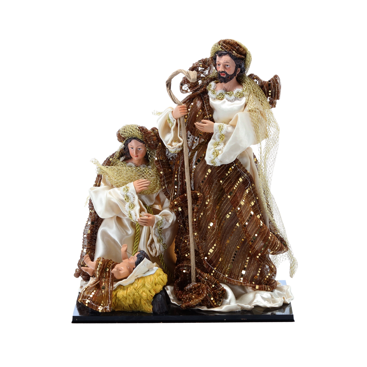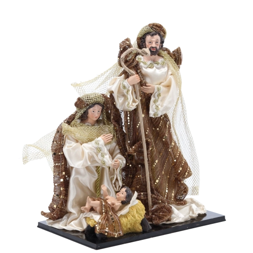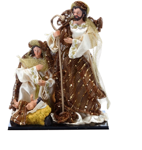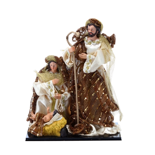 Skab en fortryllende juleatmosfære derhjemme med en elegant dekoration – figur af Den hellige familie i højden 33 cm. De omhyggeligt udformede figurer af Maria, Josef og Jesusbarnet med håndfærdiggjorte detaljer og rigt dekorerede kapper med gyldne accenter er ideelle som midtpunkt i juleudsmykningen på kommode, pejs eller det festlige bord.