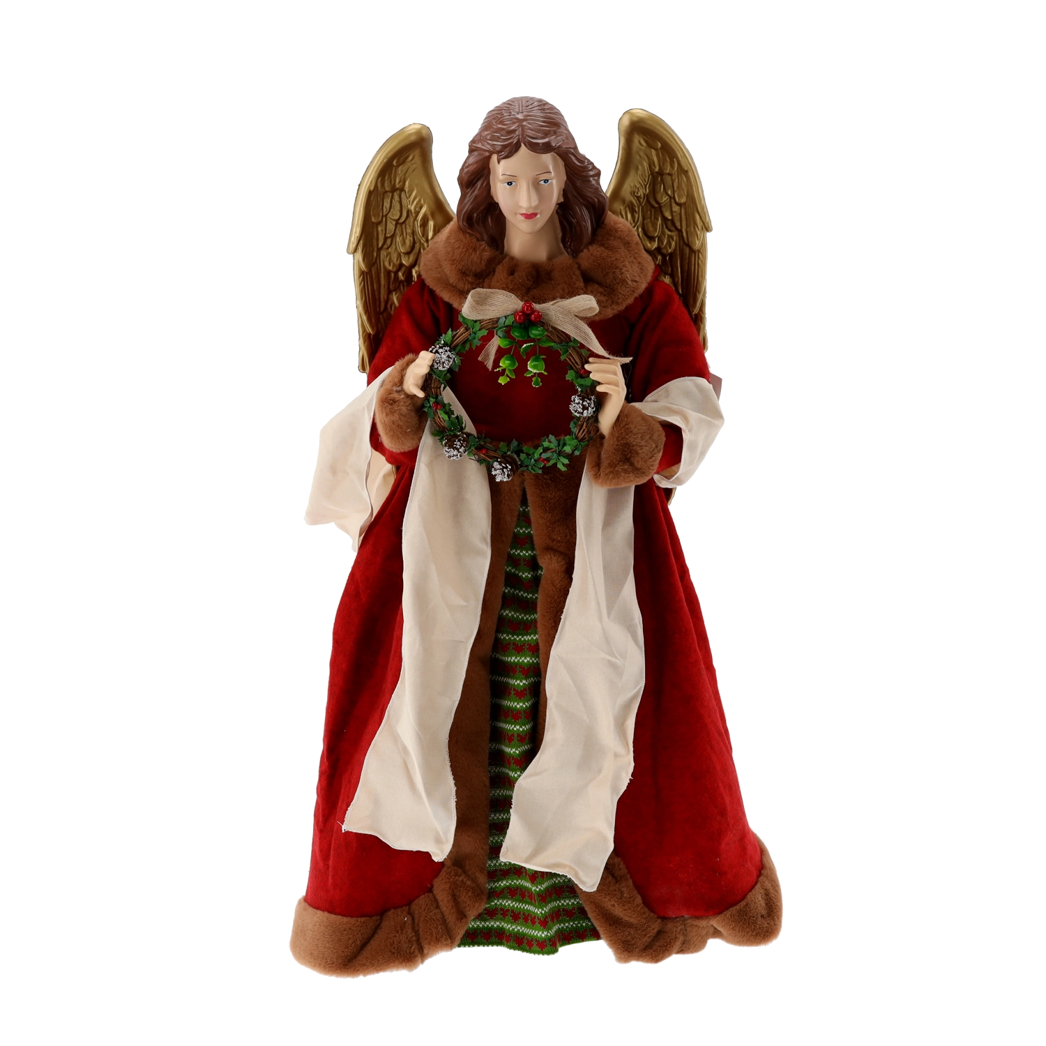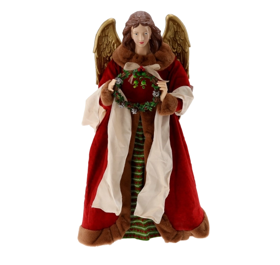 Rød tekstilkappe med hvid og brun pelskant, grønstribet nederdel og gyldne vinger understreger det festlige præg. I hænderne holder hun en julekrans.