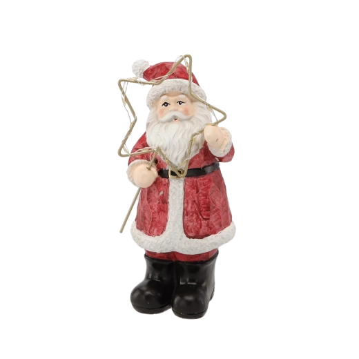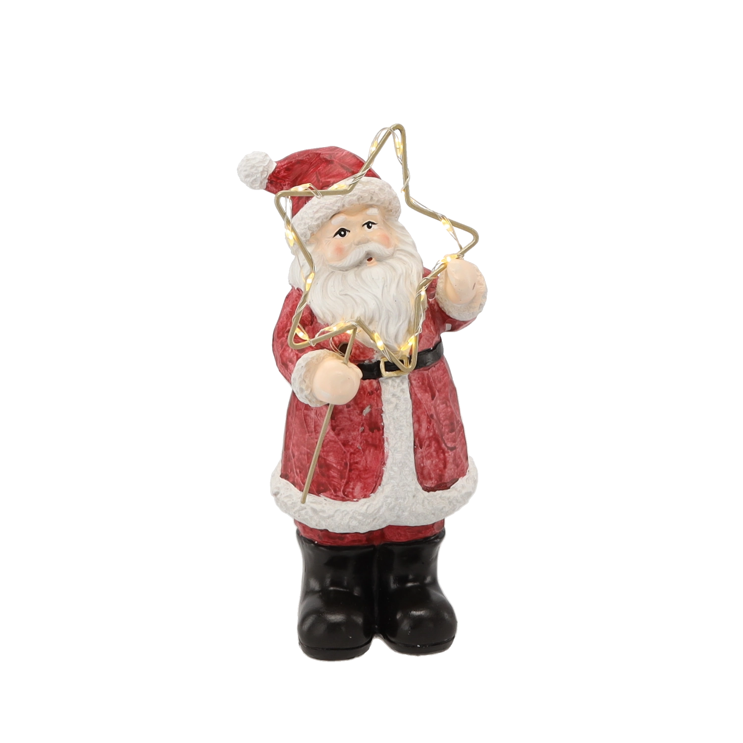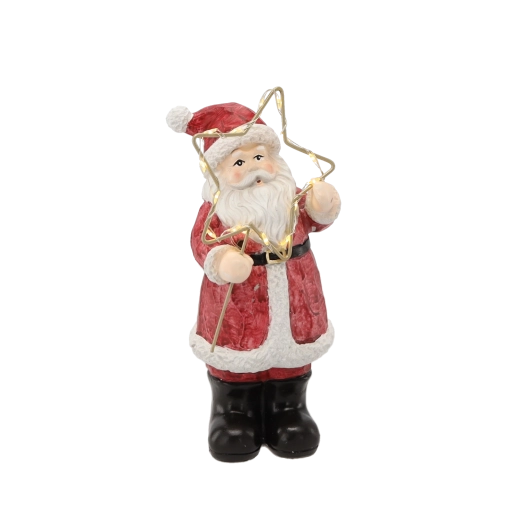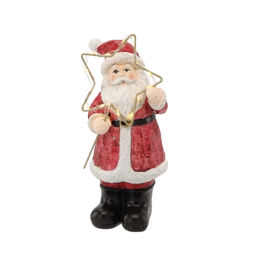 Denne julefigur af julemanden i den klassiske røde frakke bringer julestemning ind i hjemmet. Den gyldne stjerne med LED-lys spreder et blidt skær og fremhæver de fint malede detaljer – fra skæg til tekstur i tøjet. Takket være den stabile base er den ideel som borddekoration.