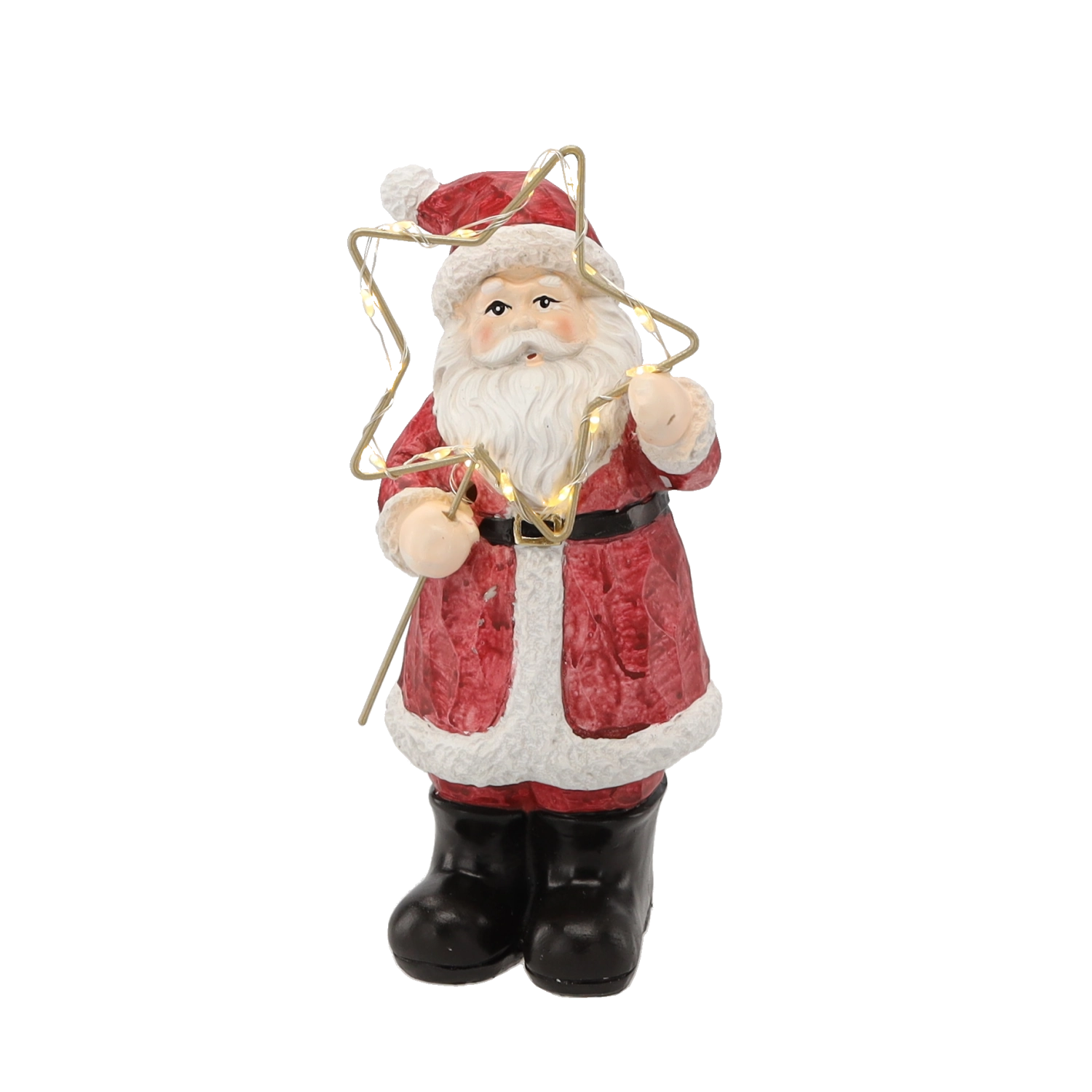 Giv dit hjem et varmt skær med denne charmerende juledekoration: en stående julemand, der holder en gylden stjerne med integreret LED-belysning. Den detaljerede figur og det varme lys skaber en hyggelig, festlig stemning på hylde, kommode eller vindueskarm.