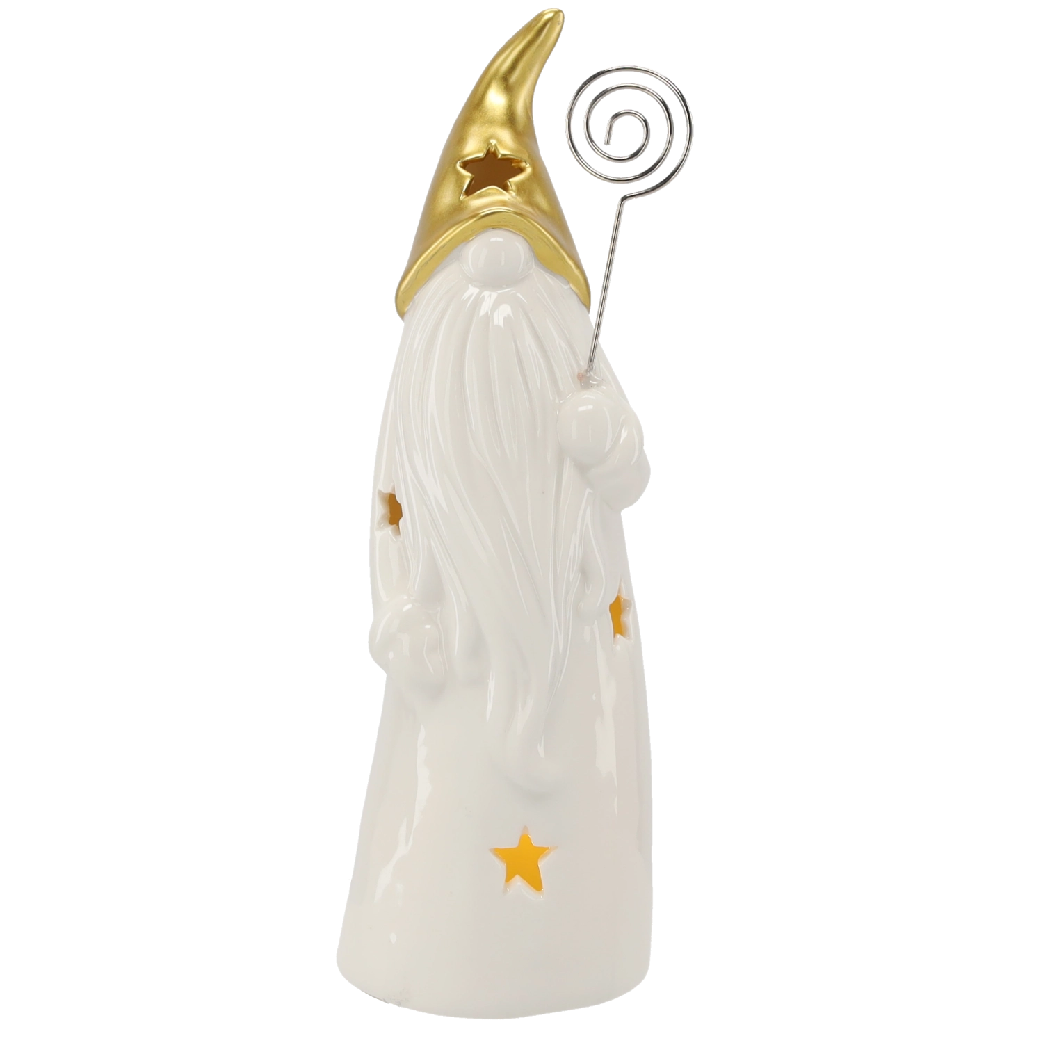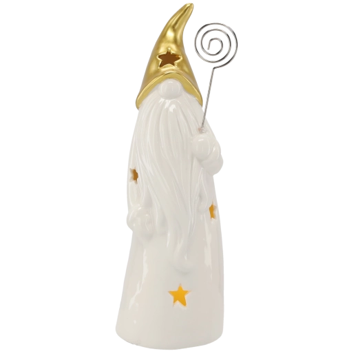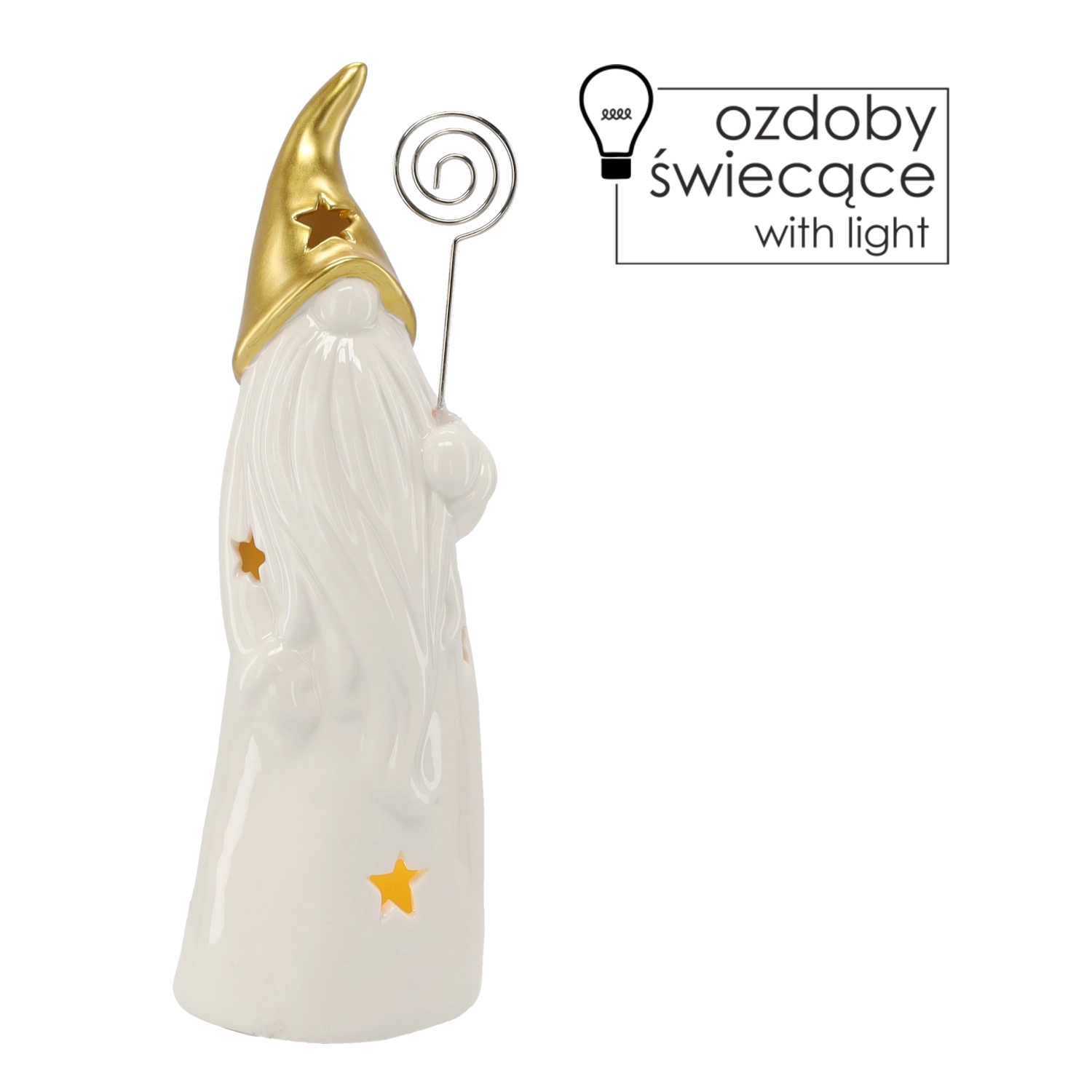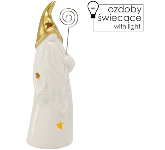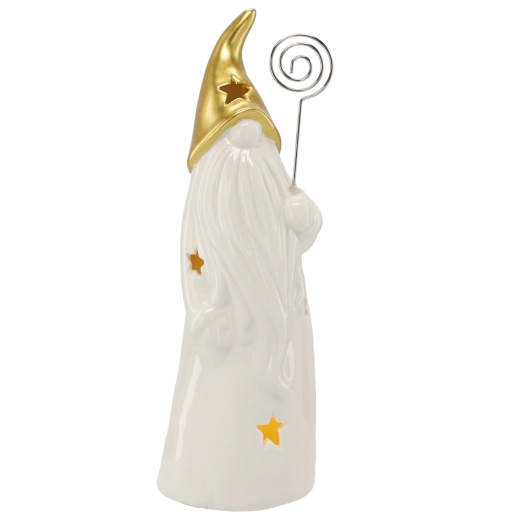 Dekorativ keramisk troldmandsfigur med en spids, gylden hat, langt hvidt skæg og stjerneformede udskæringer, som ved tænding skaber en blid lysatmosfære. Inkluderer LED-belysning drevet af batterier (medfølger), ideel som jule- og helårsdekoration til bord, kommode eller vindueskarm.