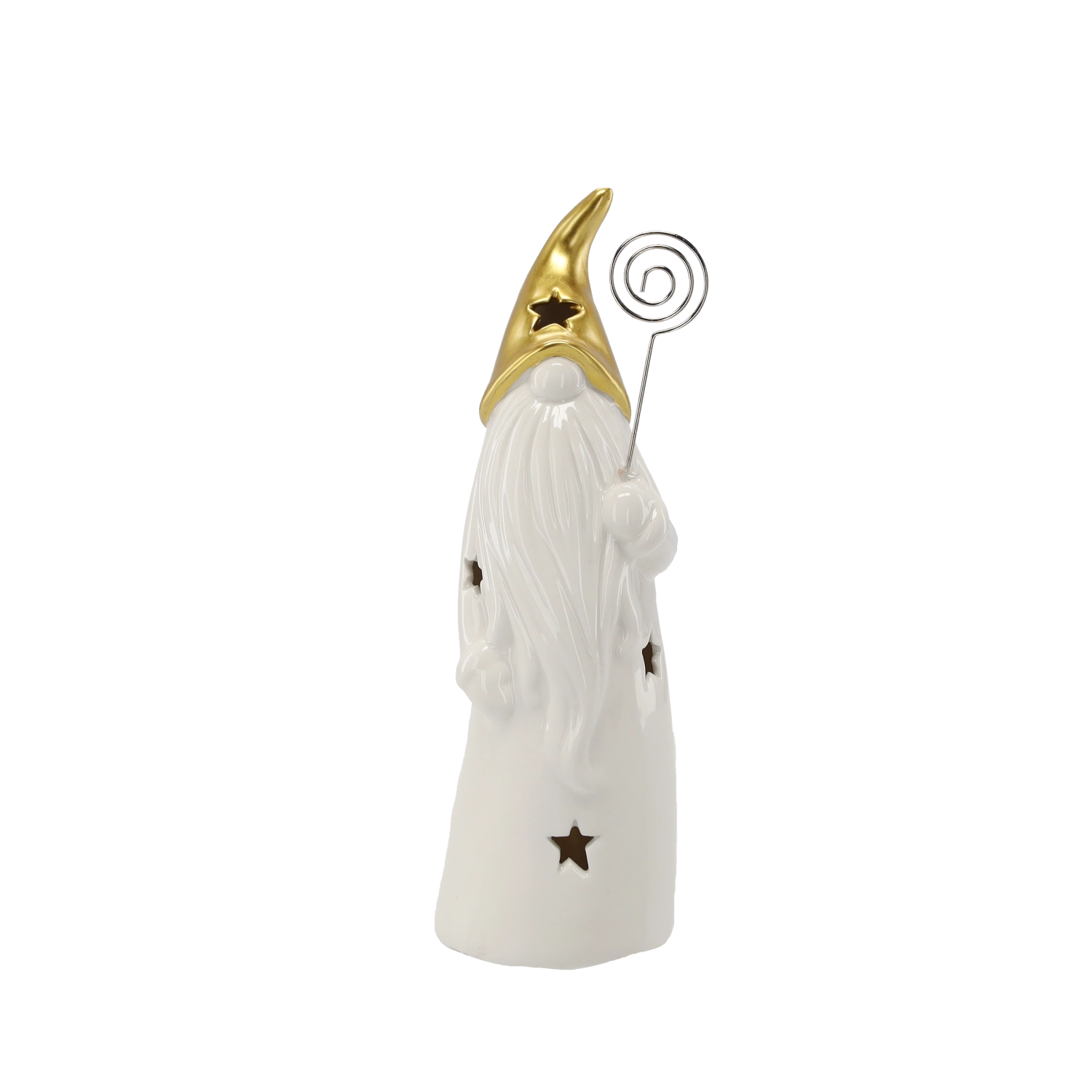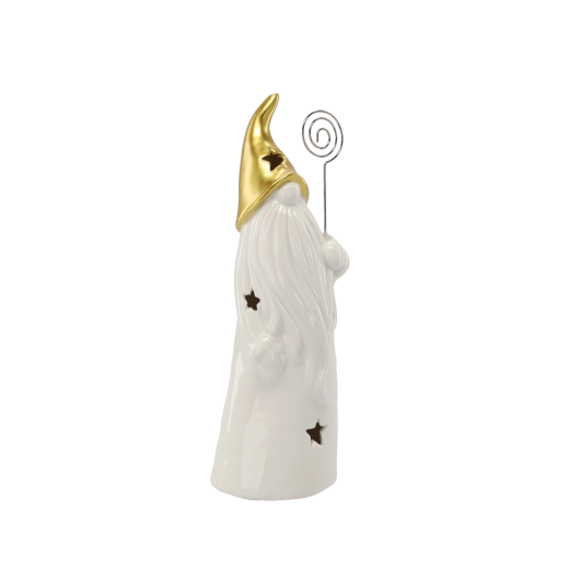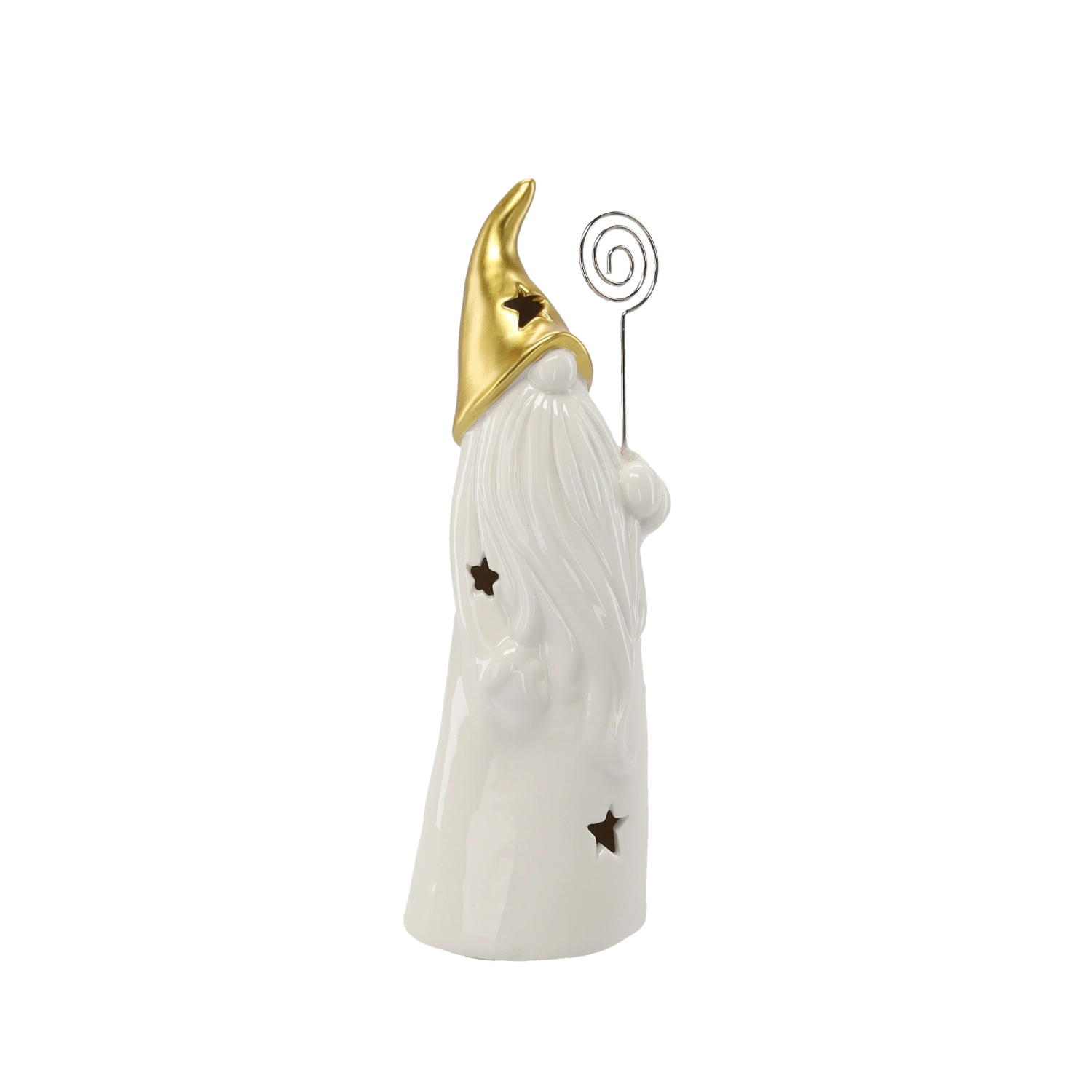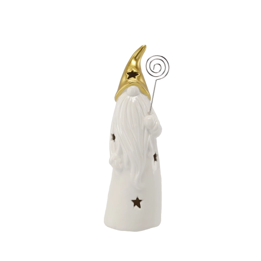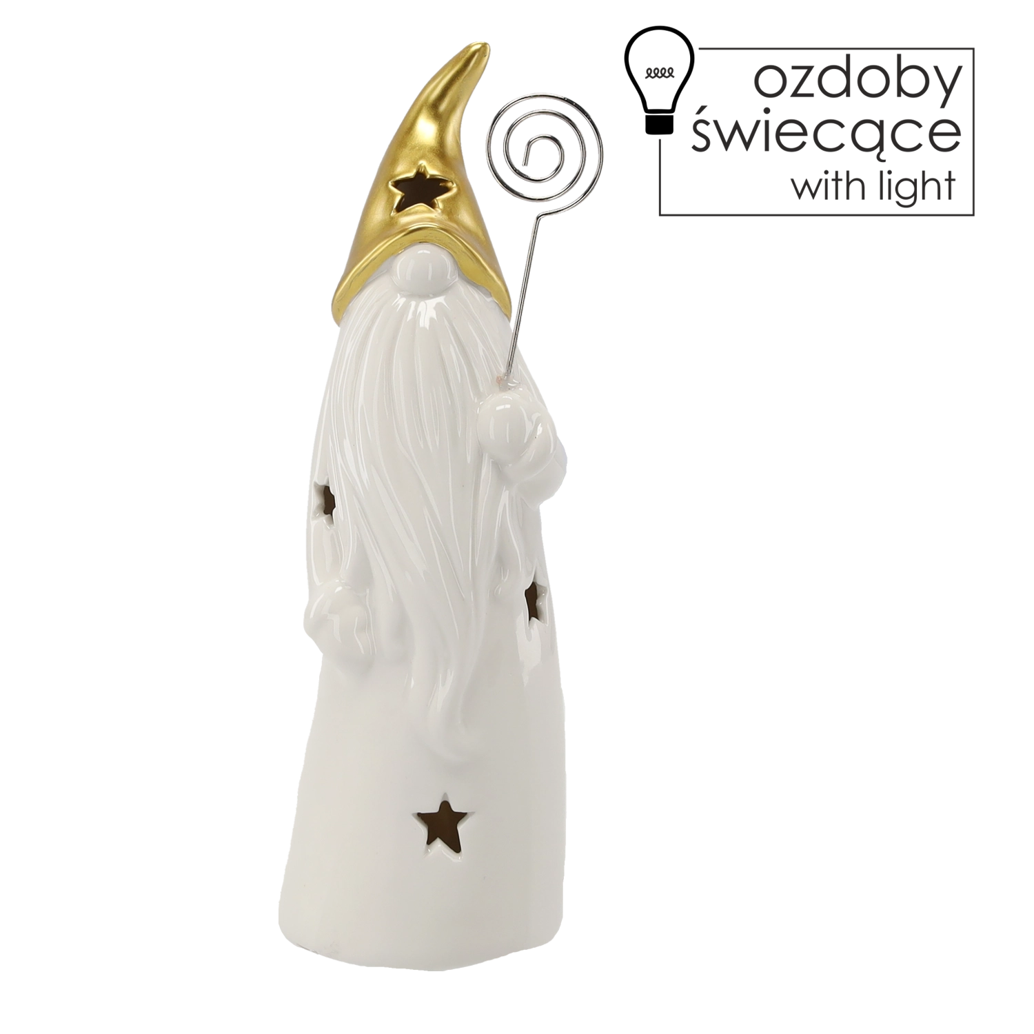 Dekorativ keramisk troldmandsfigur med en spids, gylden hat, langt hvidt skæg og stjerneformede udskæringer, som ved tænding skaber en blid lysatmosfære. Inkluderer LED-belysning drevet af batterier (medfølger), ideel som jule- og helårsdekoration til bord, kommode eller vindueskarm.