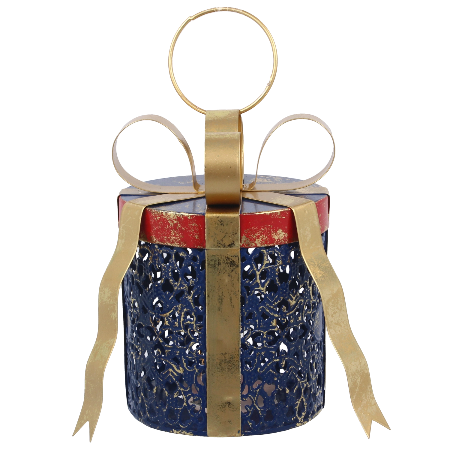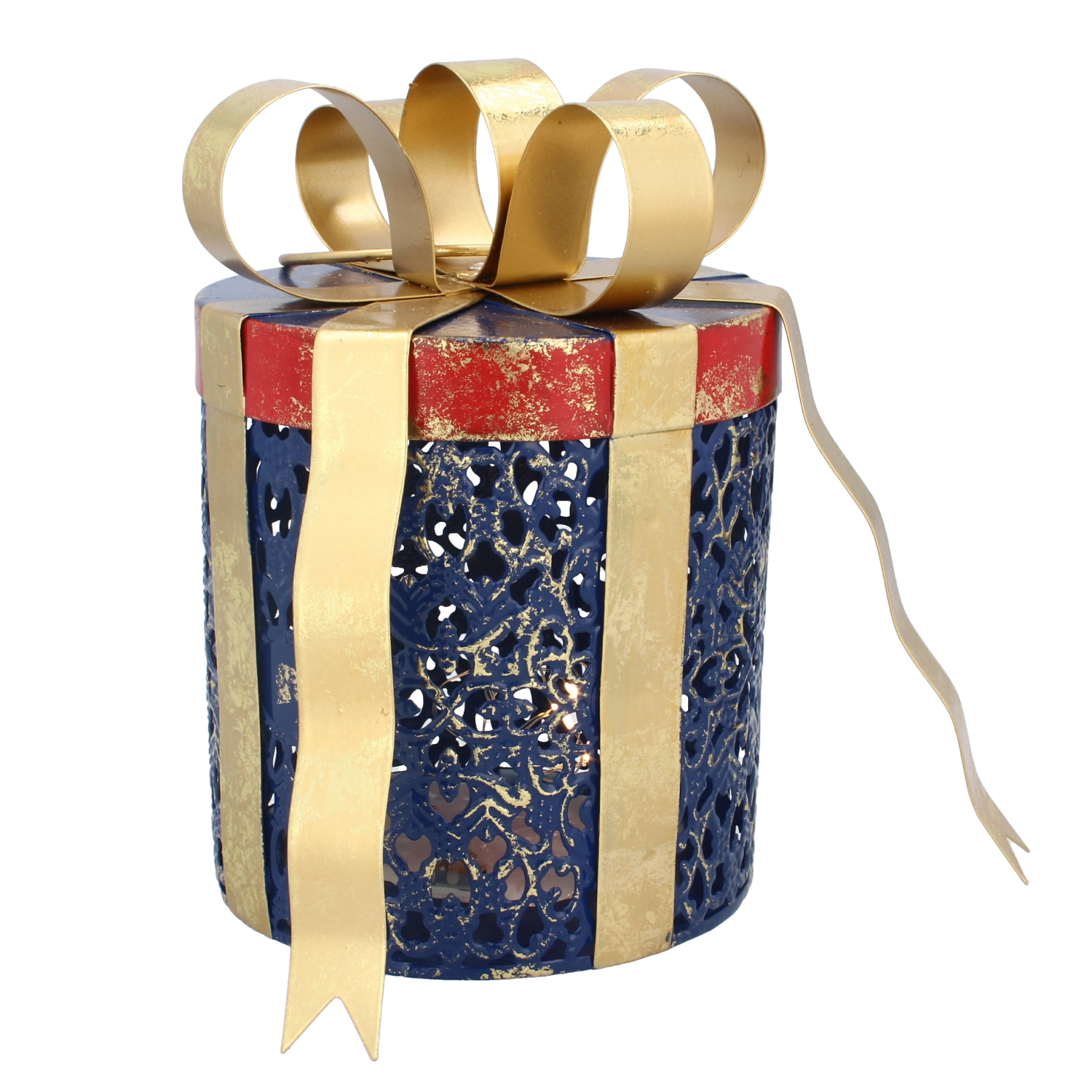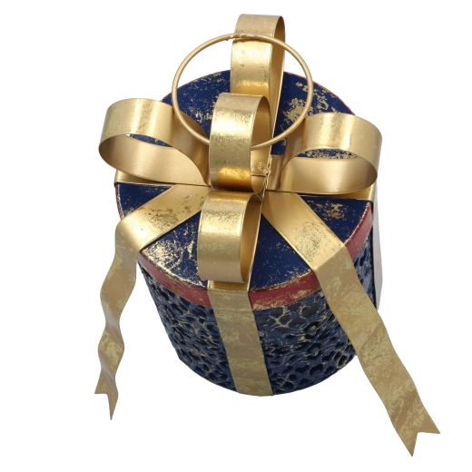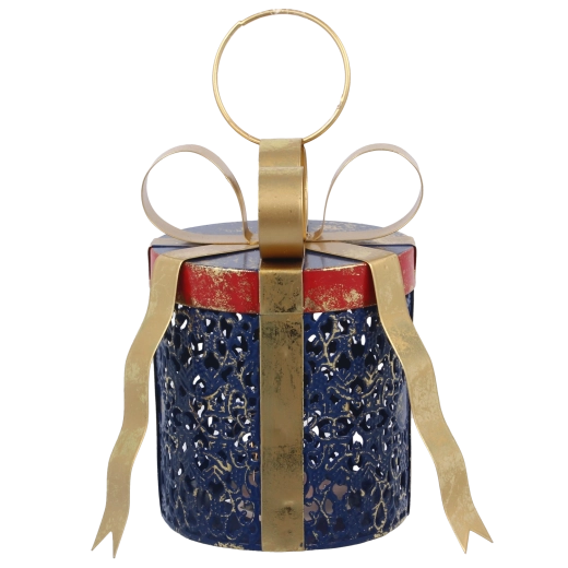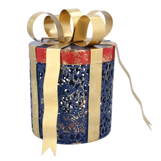 Den stilfulde juledekoration i form af en rund gave skaber straks en hyggelig, festlig atmosfære. Det blide, varme lys fra LED-dioderne skinner gennem de dekorative perforeringer og tilfører rummet en behagelig varme og visuel dybde. Kombinationen af blåt metal og gylden sløjfe passer perfekt til både traditionelle og moderne arrangementer.