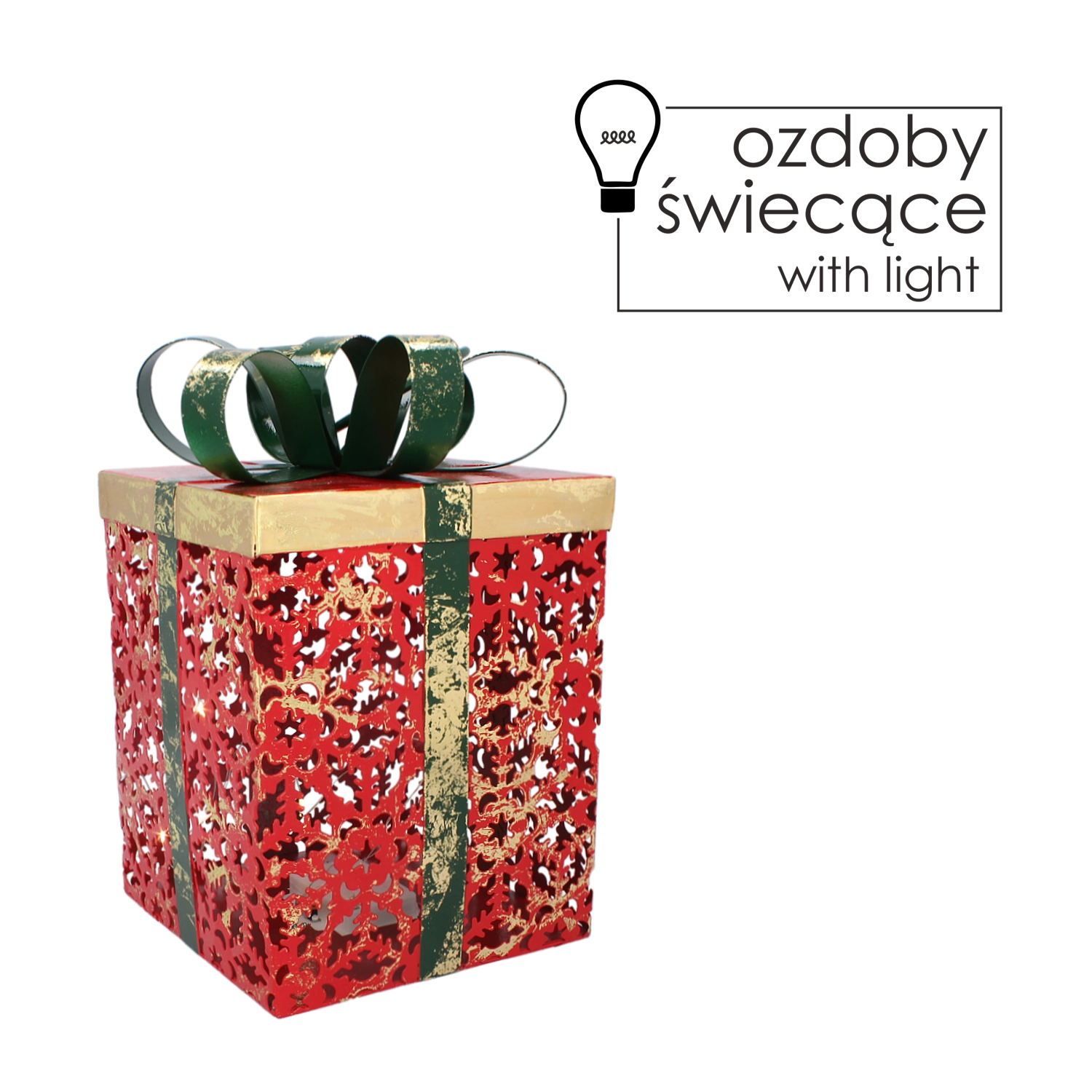 Giv dit hjem julestemning med denne stilfulde metaldekoration formet som en gave. Den røde udformning med fine udskæringer lader LED-belysningen skinne smukt igennem og skabe effektfulde lyseffekter, mens den grønne sløjfe understreger det traditionelle festlige udtryk.