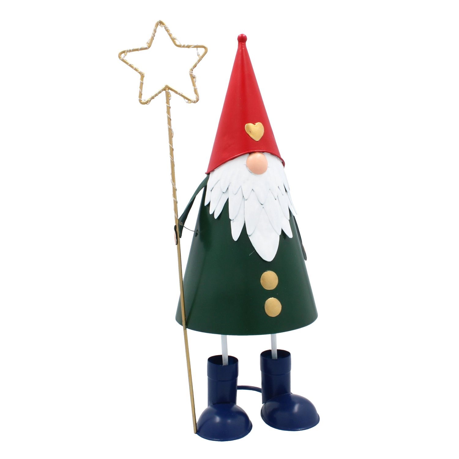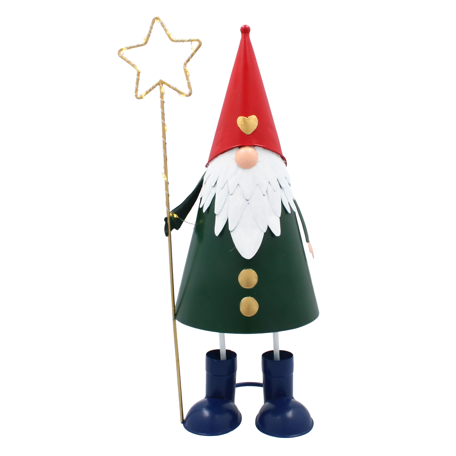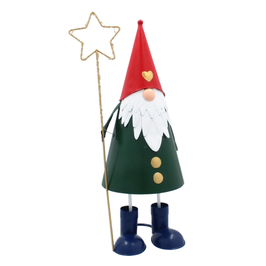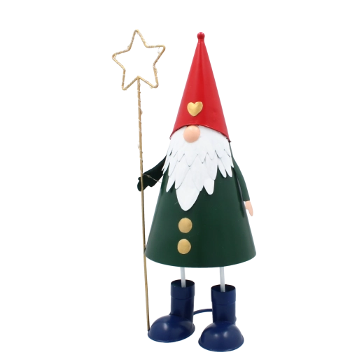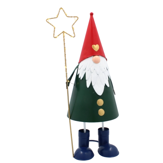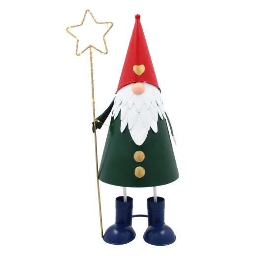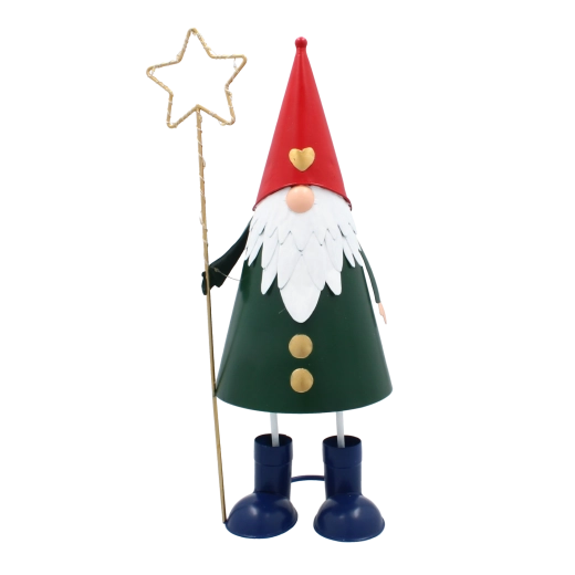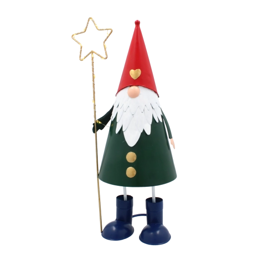 Denne dekorative metalnisse kombinerer et legende udtryk med praktisk LED-belysning. Den høje, slanke silhuet med rød hue, grøn krop og en gylden stjerne i hånden tager sig stilfuldt ud i vindueskarmen, på kommoden eller på det festligt dækkede bord. Varmt hvidt lys skaber en behagelig julestemning i ethvert rum.