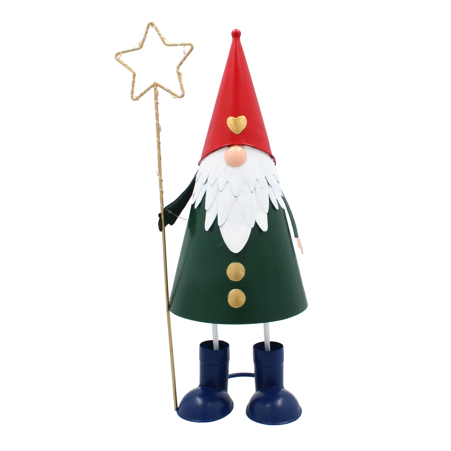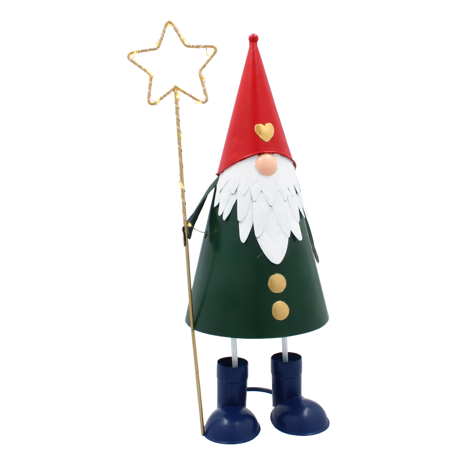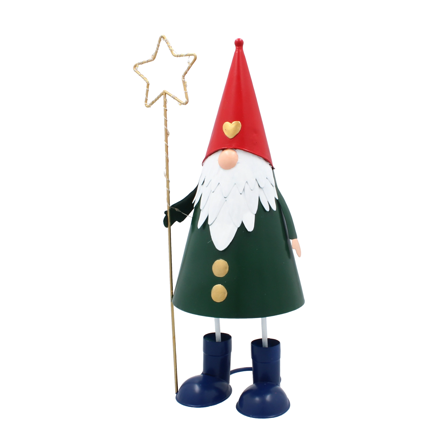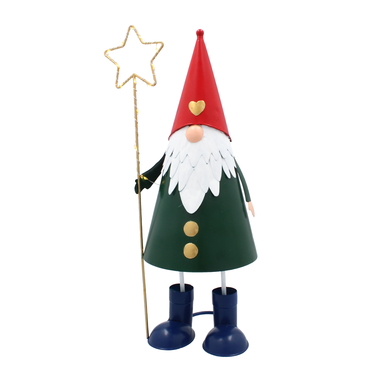 Denne dekorative metalnisse kombinerer et legende udtryk med praktisk LED-belysning. Den høje, slanke silhuet med rød hue, grøn krop og en gylden stjerne i hånden tager sig stilfuldt ud i vindueskarmen, på kommoden eller på det festligt dækkede bord. Varmt hvidt lys skaber en behagelig julestemning i ethvert rum.