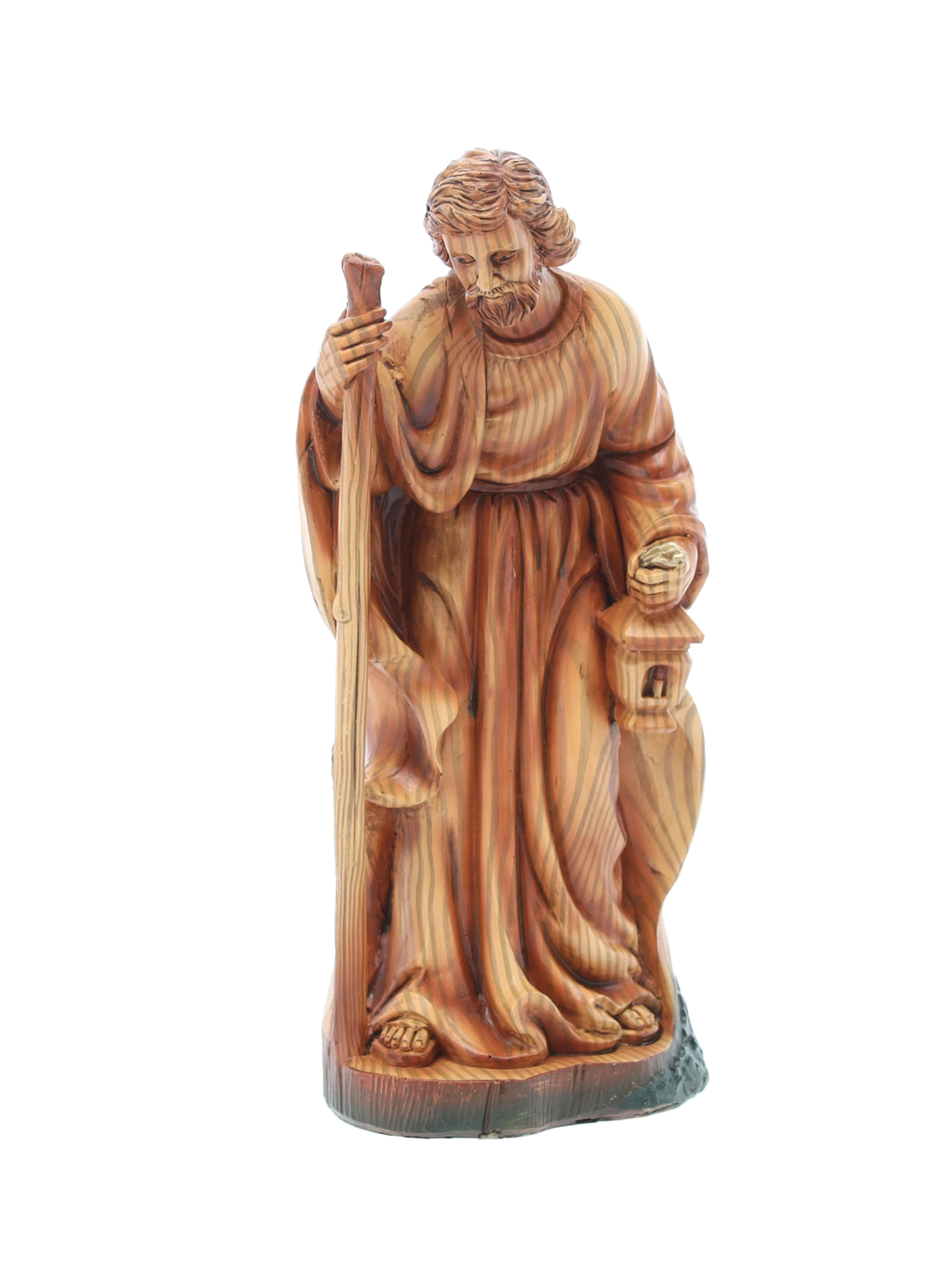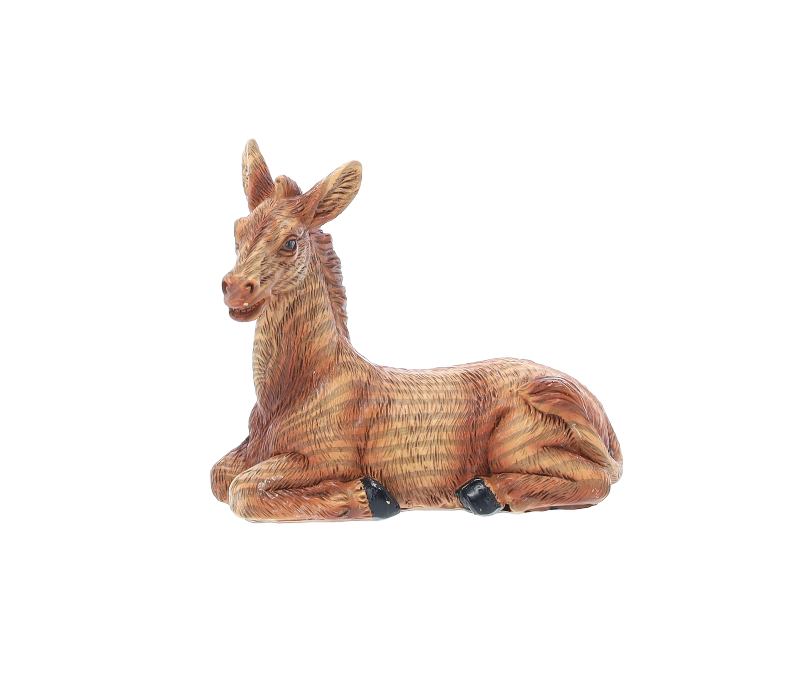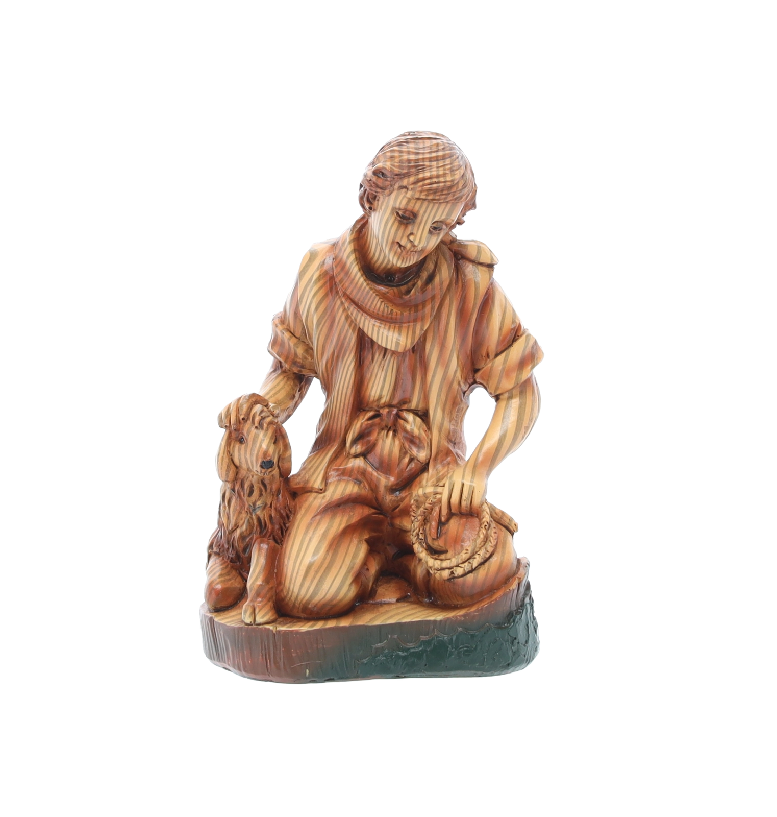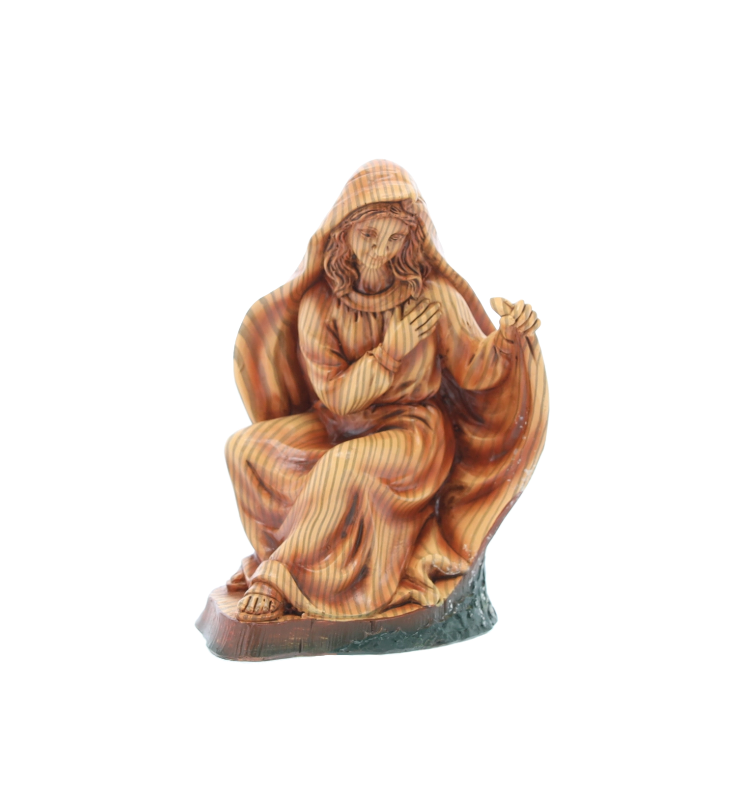 Hver figur er omhyggeligt håndmalet med fine overgange og teksturer, som fremhæver ansigtstræk, draperingers folder og dyrenes naturlige udseende.