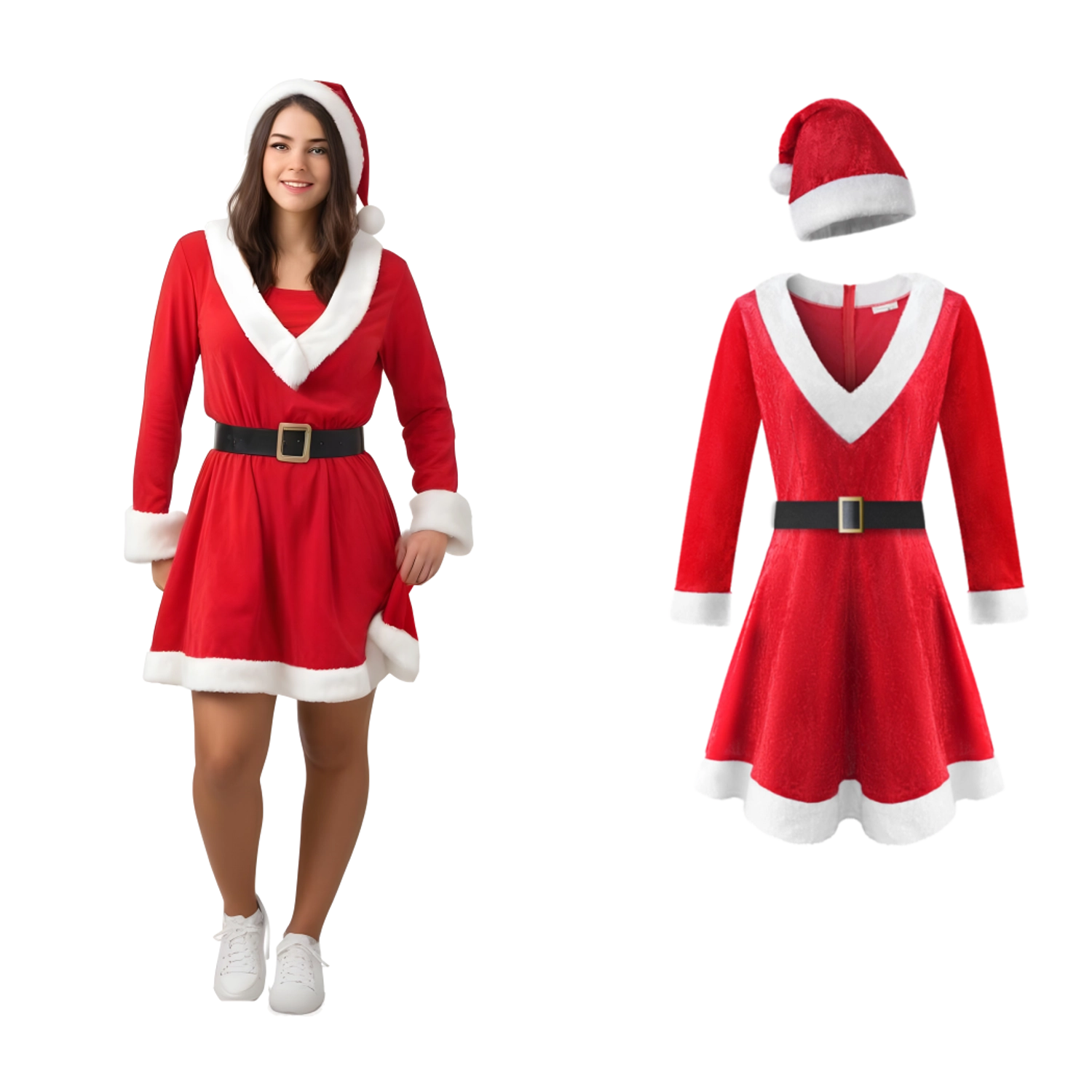 Det komplette sæt indeholder alt, hvad du behøver for et øjeblikkeligt julelook – kjole, hue og bælte. Perfekt til firmafesten, hygge ved pejsen og pakkeuddeling. Nemt at tage på og en behagelig pasform giver fri bevægelighed hele aftenen.