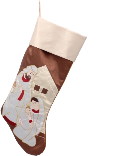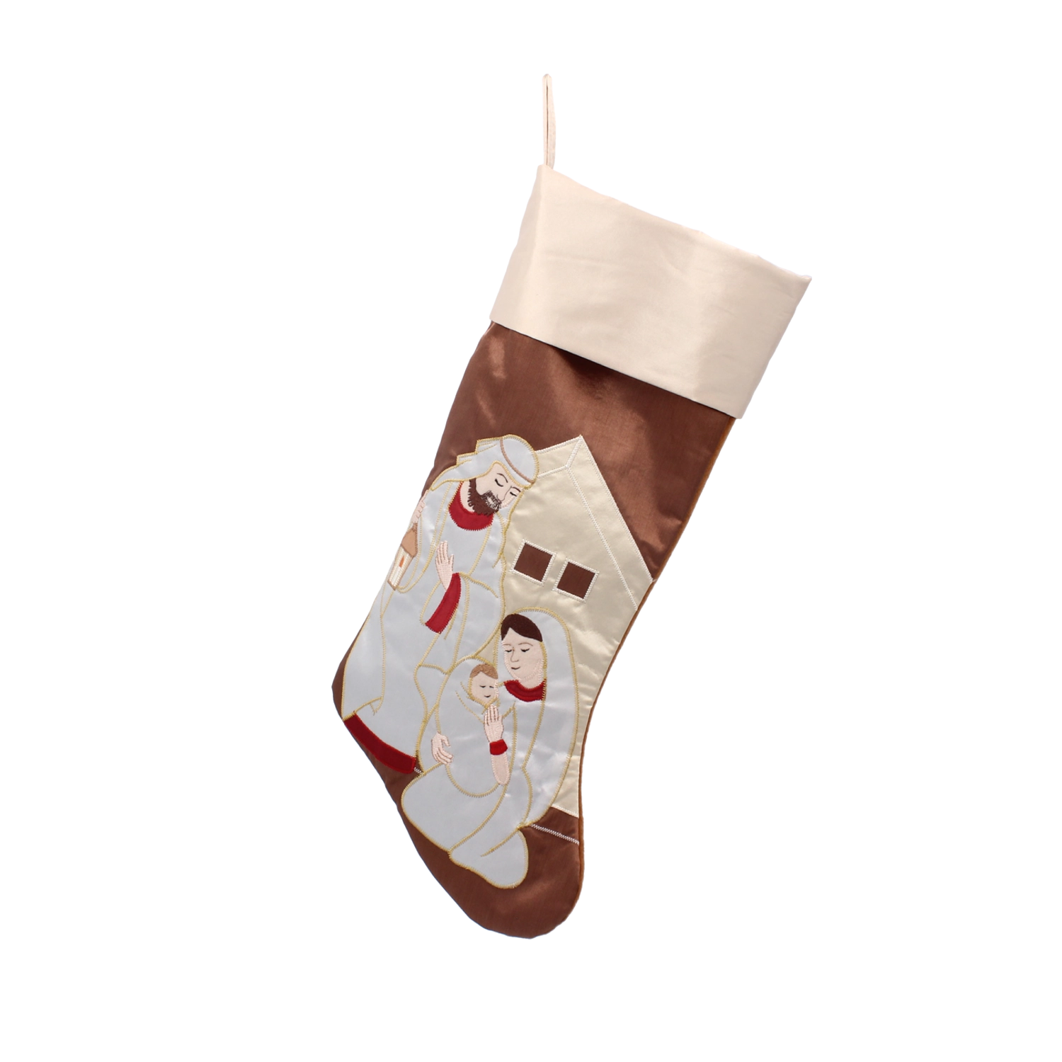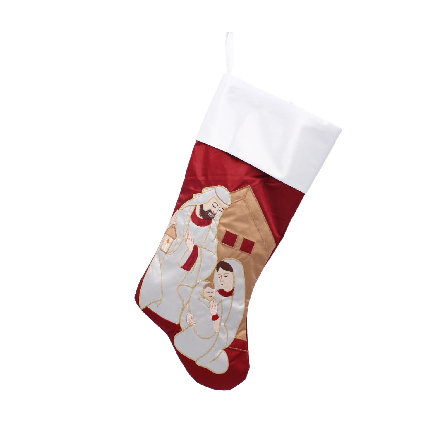 Den detaljerede applikation af Den Hellige Familie i krybbescenen giver strømpen et traditionelt udtryk og gør den til et blikfang i din juleudsmykning.