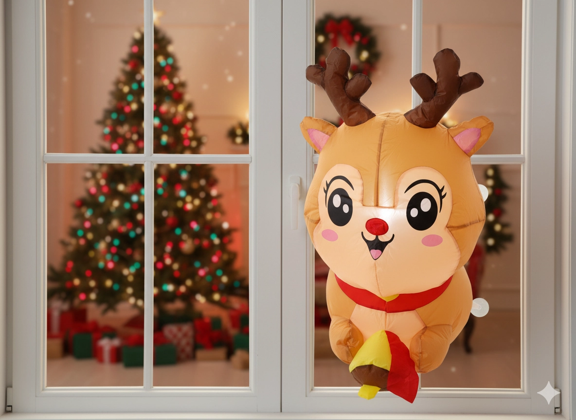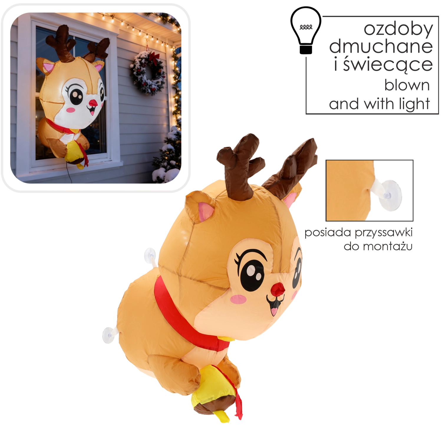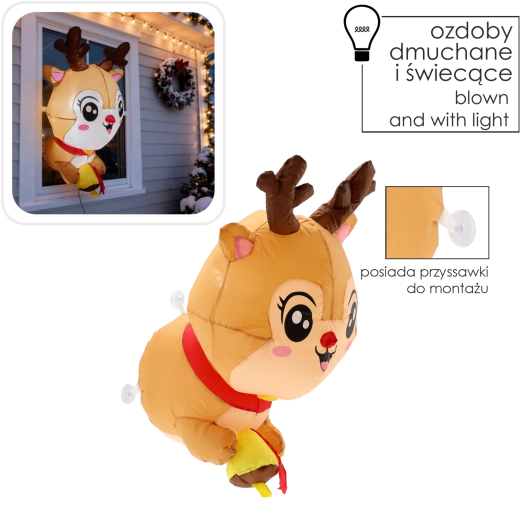 Det charmerende oppustelige rensdyr med store øjne, gevir og rød halstørklæde lyser op i vinduer, udstillingspartier og indgange. Varmt LED-lys skaber en behagelig aftenstemning og fanger opmærksomheden på afstand. Installationen klares på ingen tid – takket være sugekopper sidder den fast på glat glas eller spejl uden værktøj og uden rod.