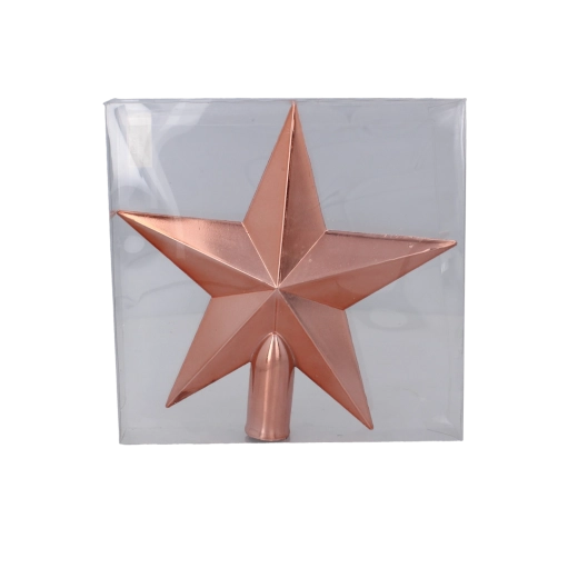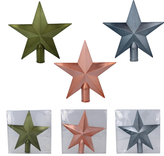 Elegant julespids formet som en stjerne i højden 20 cm, som giver træet en moderne glans og festlig stemning. Let og holdbar plast sikrer nem montering og lang levetid. Fås i tre sofistikerede farver: olivengrøn, kobber og grafit – ideel til de fleste interiører.