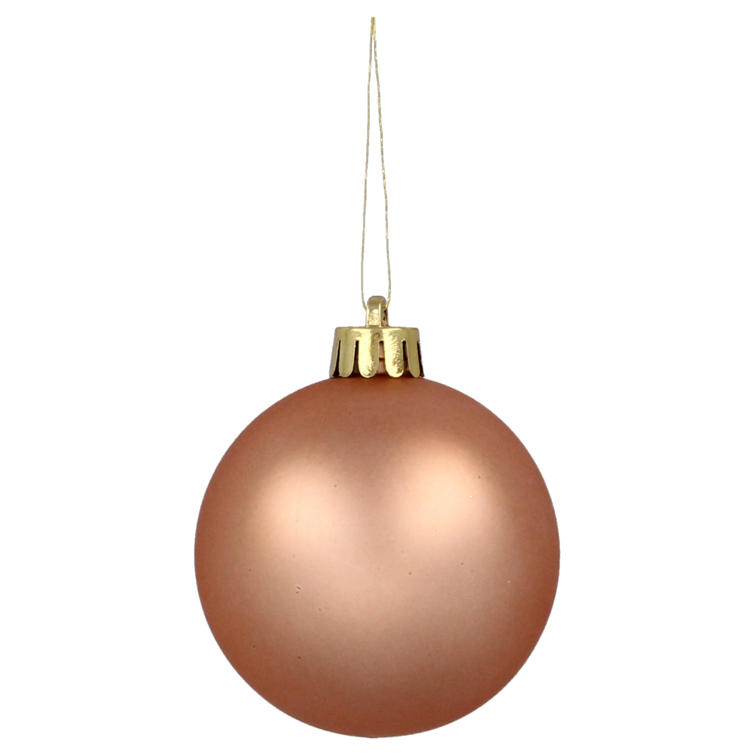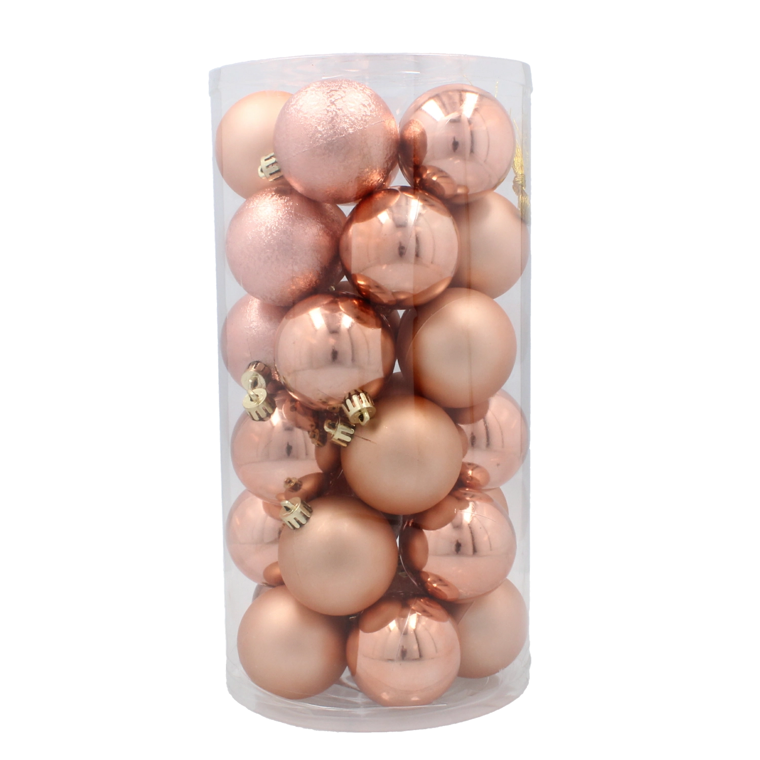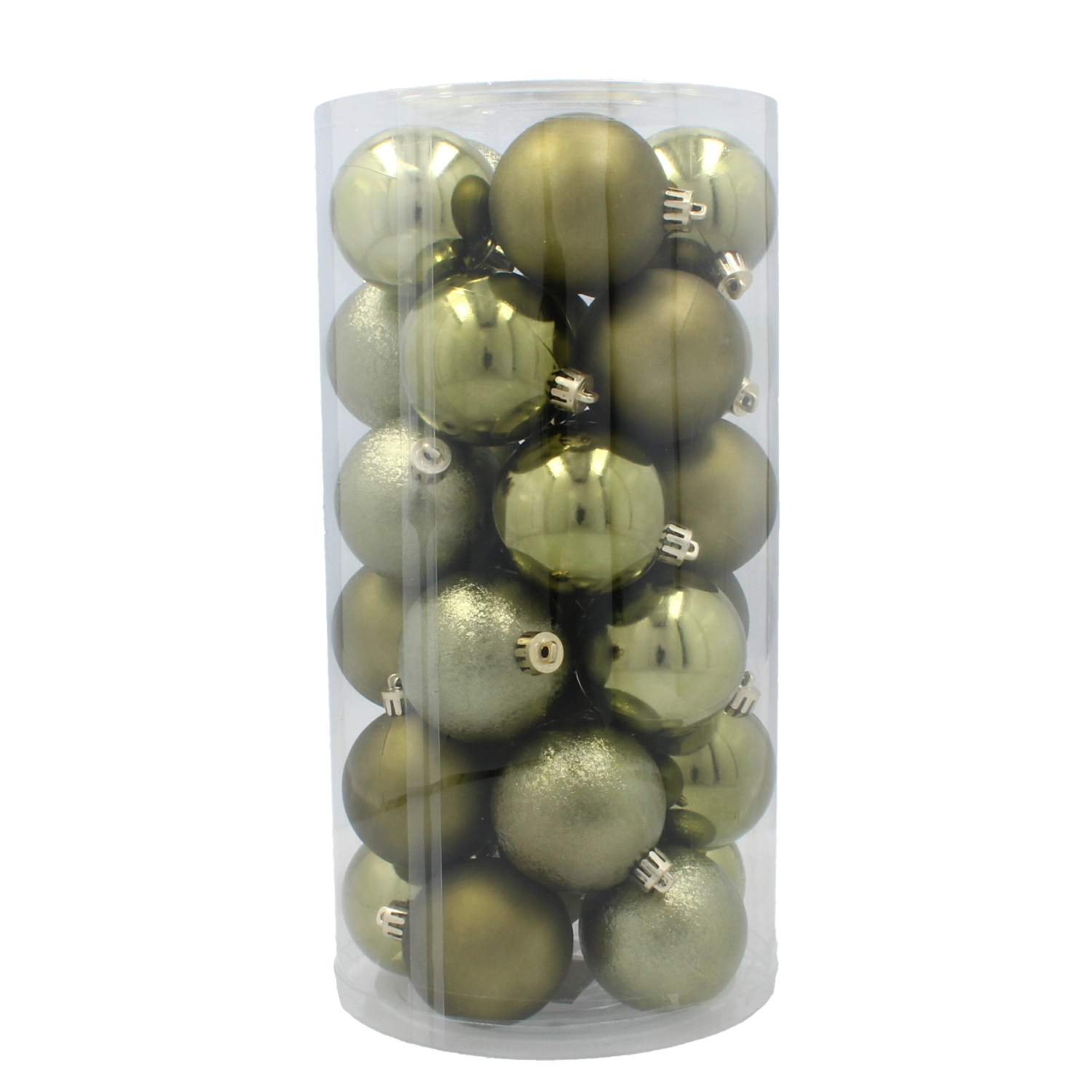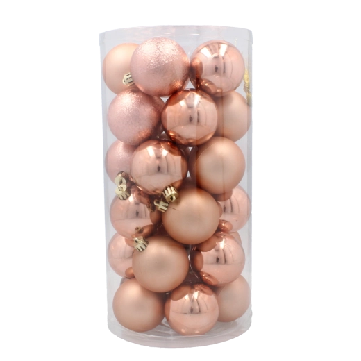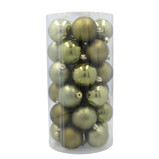Stilfuldt sæt med 30 juleornamenter på 6 cm i diameter i elegante nuancer af oliven, kobber og grafit, som giver dit hjem en moderne, festlig atmosfære. De holdbare plastikkugler med blank, mat og glitrende overflade er lette, uknuselige og sikre for både børn og kæledyr.