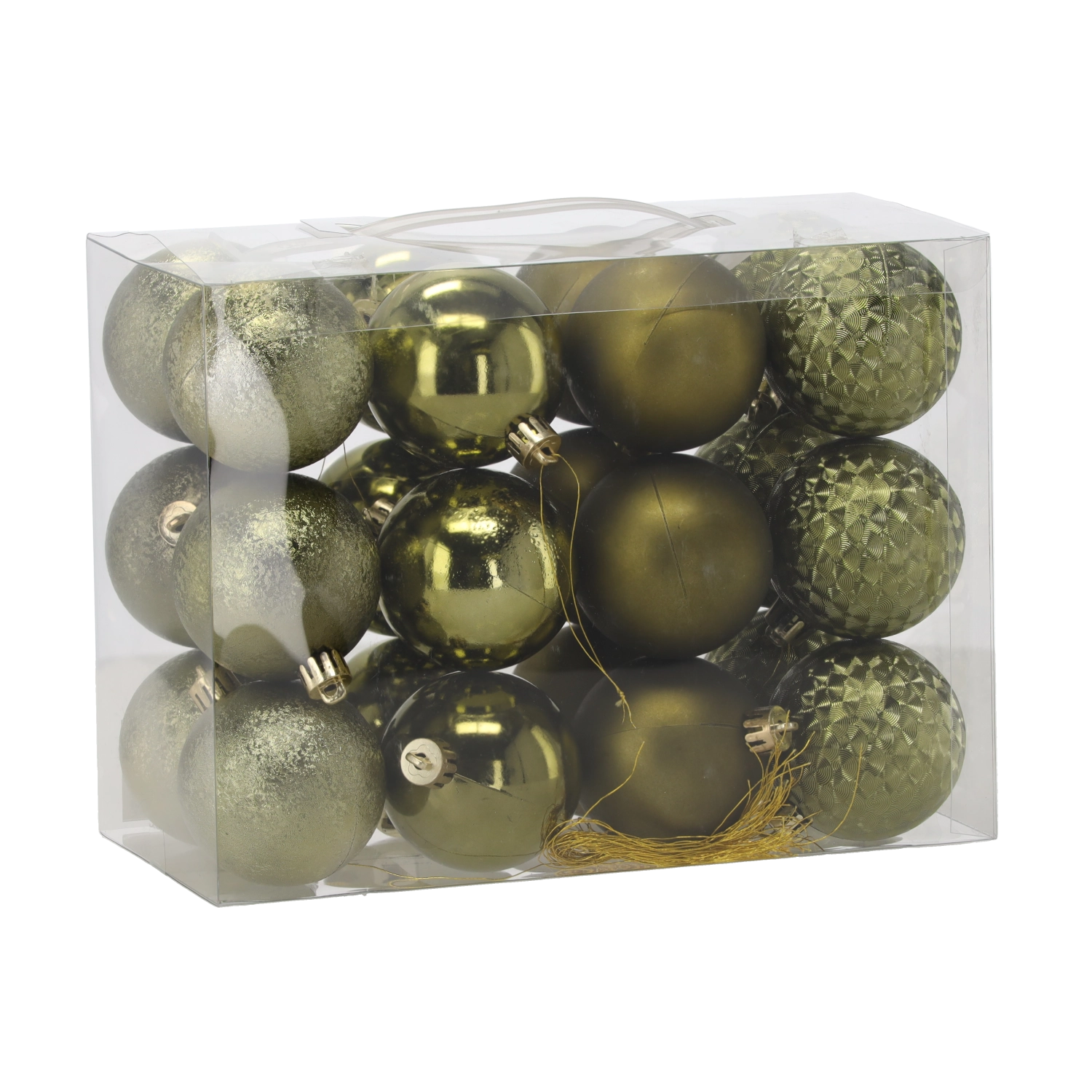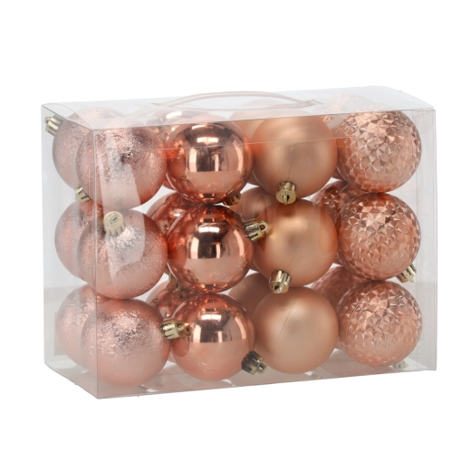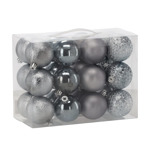 Giv træet et moderne twist med et sæt på 24 julekugler med en diameter på 6 cm i oliven-, kobber- og grafitfarver. Pynten er af let plast og derfor uknuselig – ideel til hjem med børn og kæledyr. De forskellige overflader – glans, mat, glitter og facetdesign – skaber iøjnefaldende dybde og variationsmuligheder.
