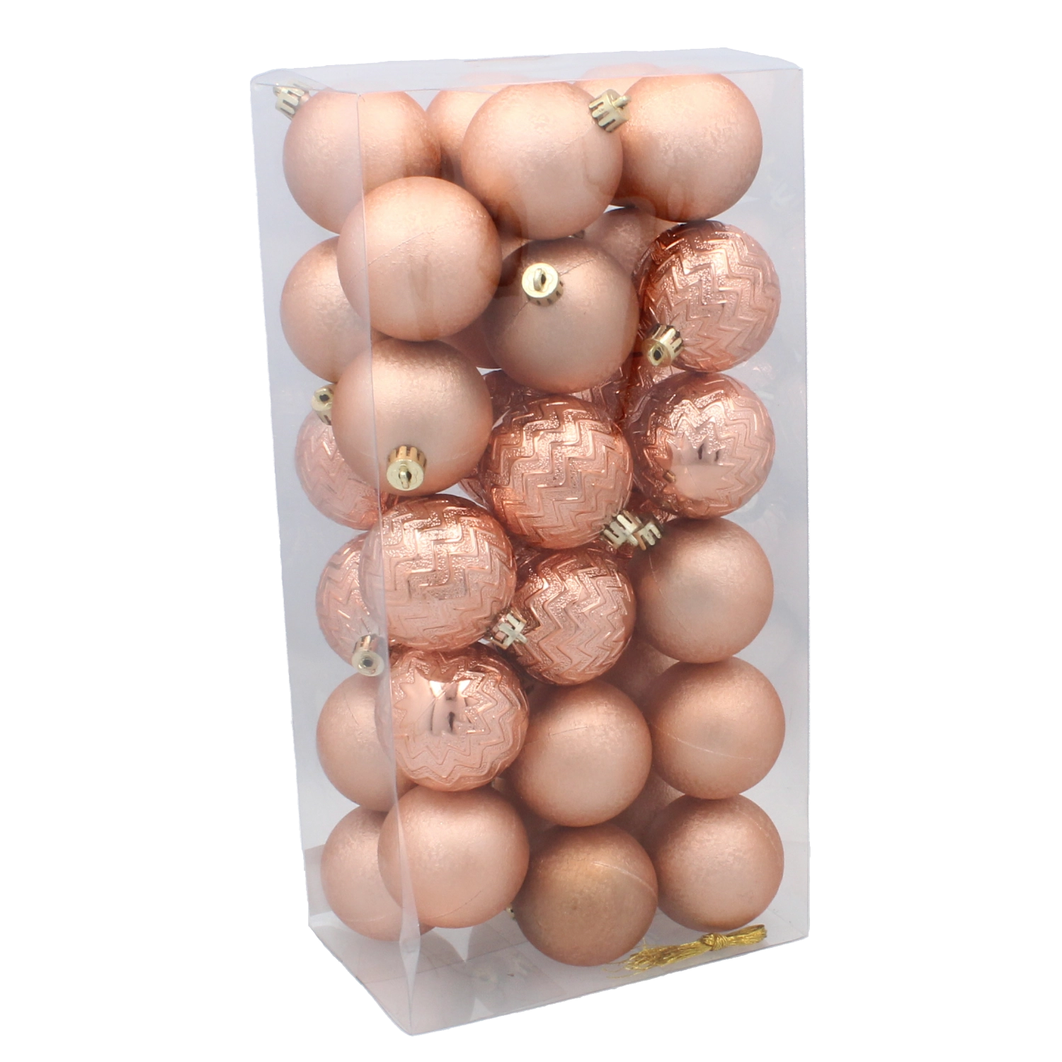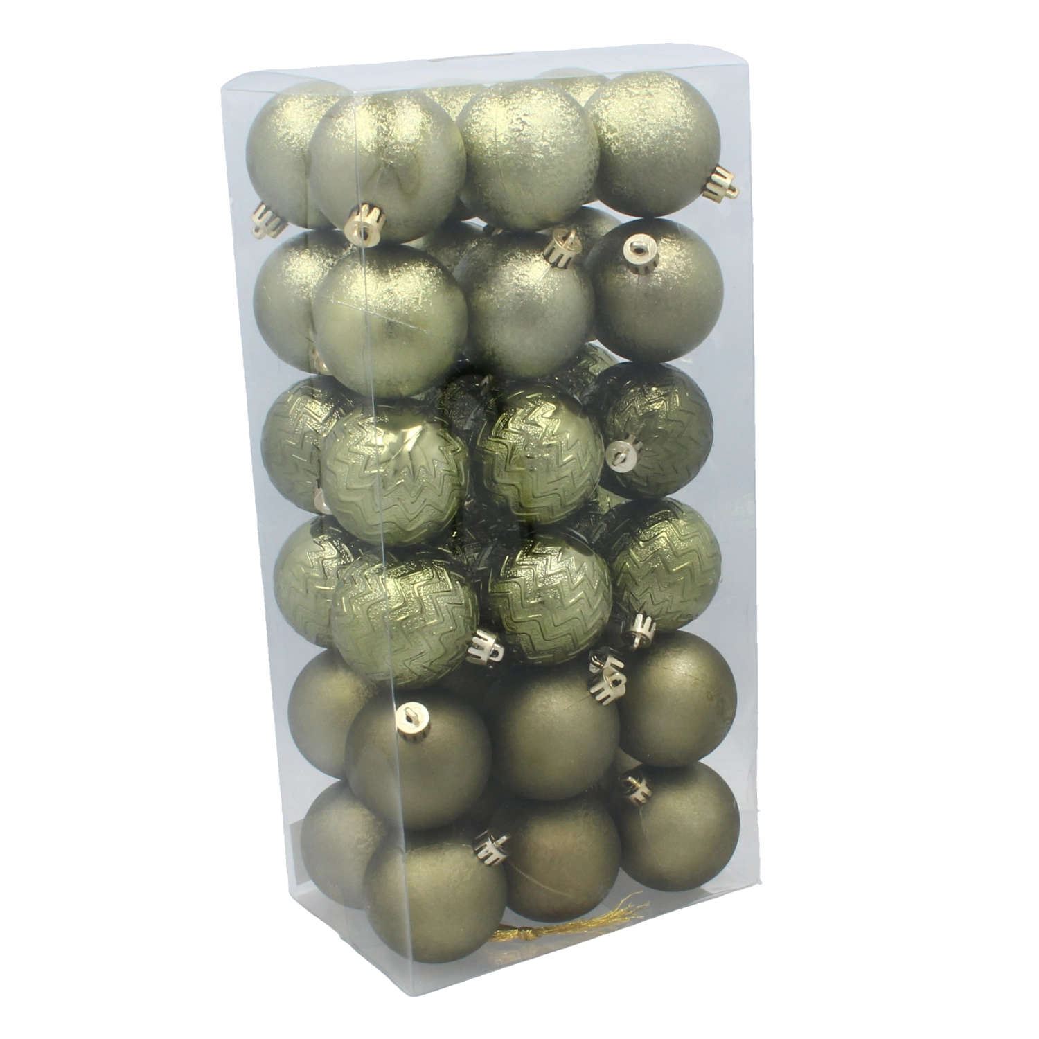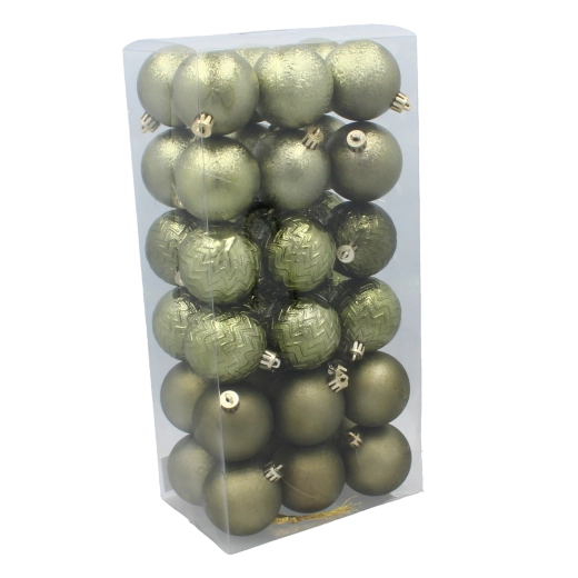 Skab et perfekt afstemt juletræ med et sæt på 36 kugler med en diameter på 6 cm i elegante toner af oliven, kobber og grafit. Det lette og holdbare plastmateriale er ubrudsikkert, så det passer til hjem med både børn og kæledyr. Kombinationen af matte og blanke overflader samt forskellige designs muliggør kreativ dekoration og et stilrent, moderne udtryk i indretningen.