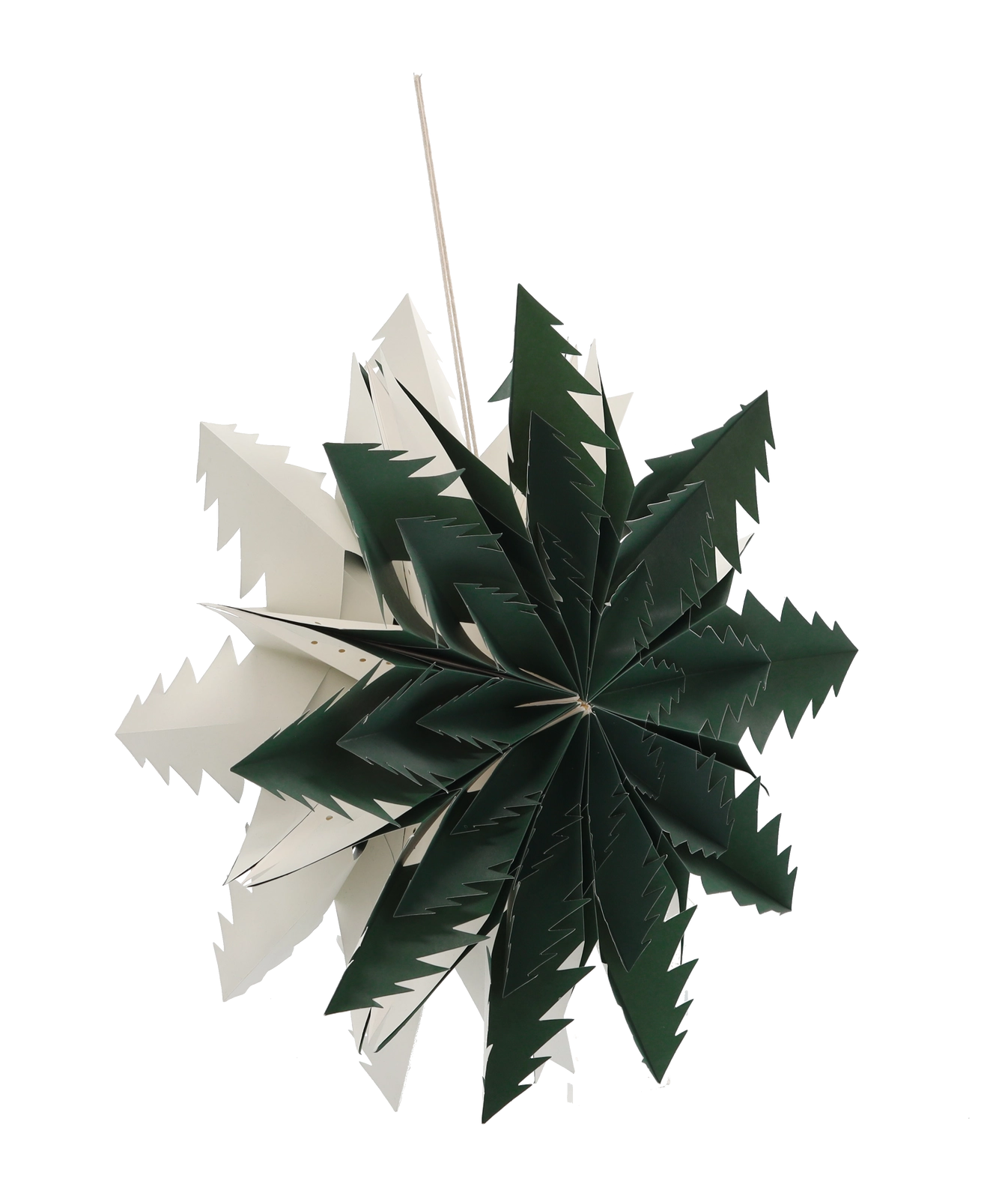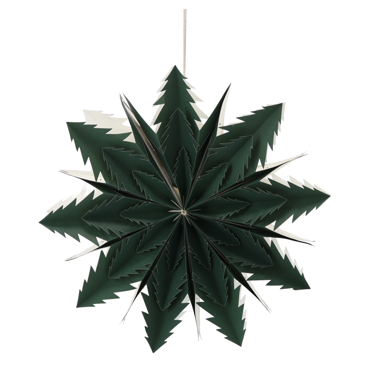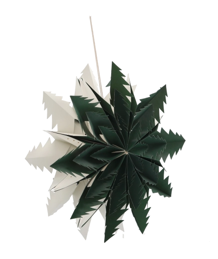 Denne stilfulde papirstjerne i mørkegrøn er en tidløs vinter- og højtidsdekoration. Let, sammenklappelig og genanvendelig – hænges op på få øjeblikke i vinduet, i loftet eller i udstillingsvinduet og skaber behagelig stemningsbelysning med hyggelig charme.