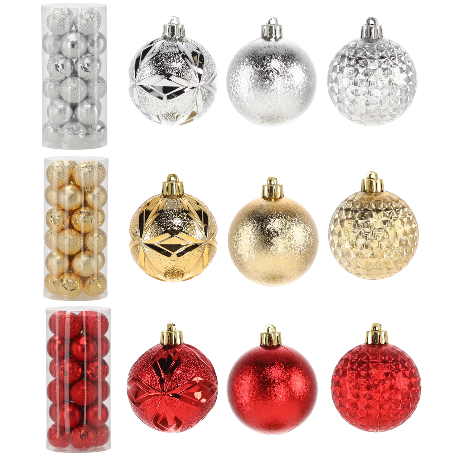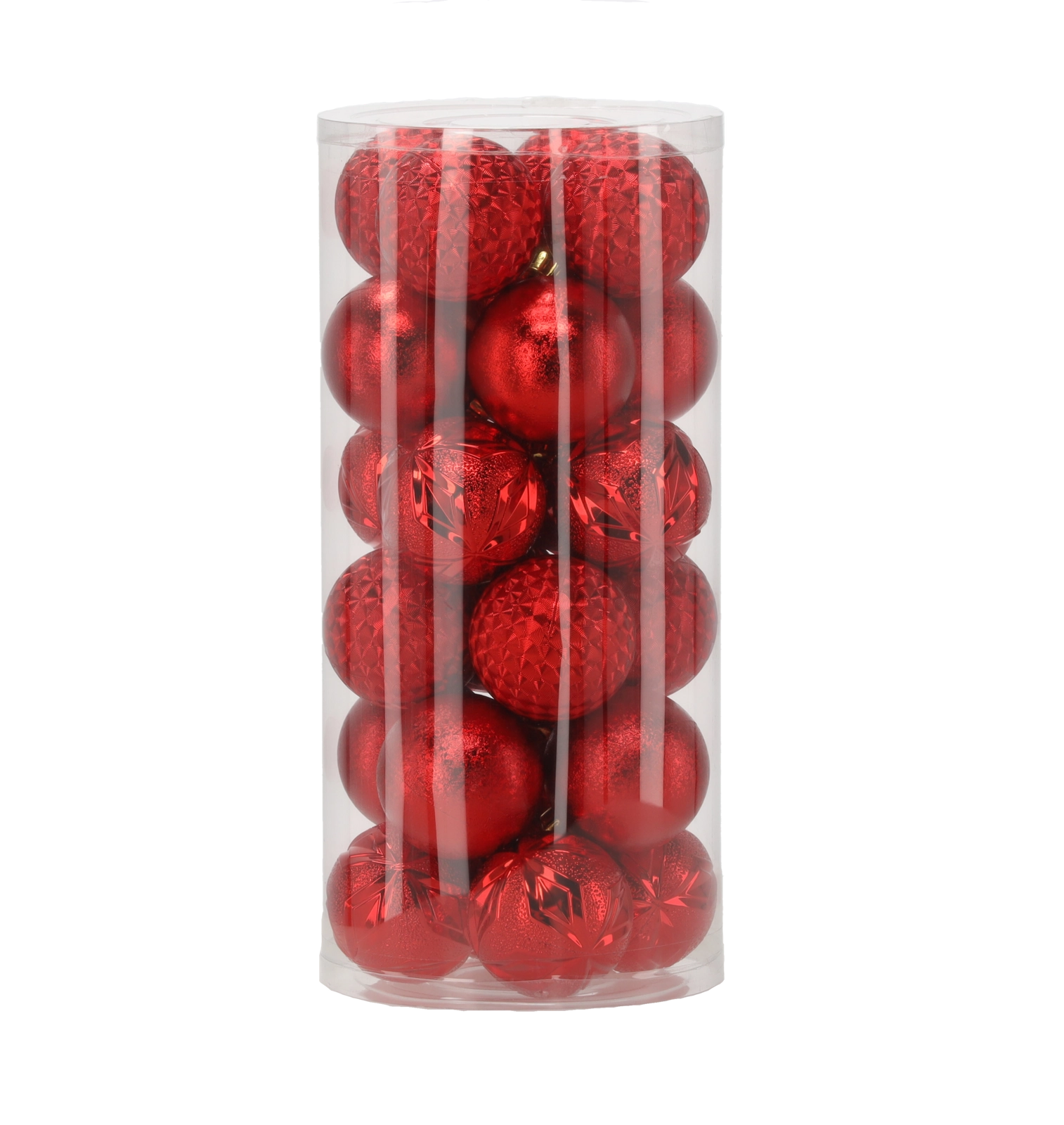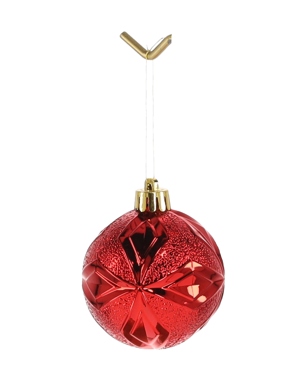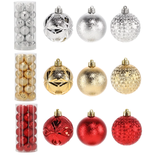 Dette elegante sæt indeholder 24 julekugler med en diameter på 6 cm i en tidløs kombination af rød, guld og sølv. Forskellige overflader som blank, struktureret og glitter giver dit træ både dybde og glans og hjælper med at skabe en harmonisk udsmykning.