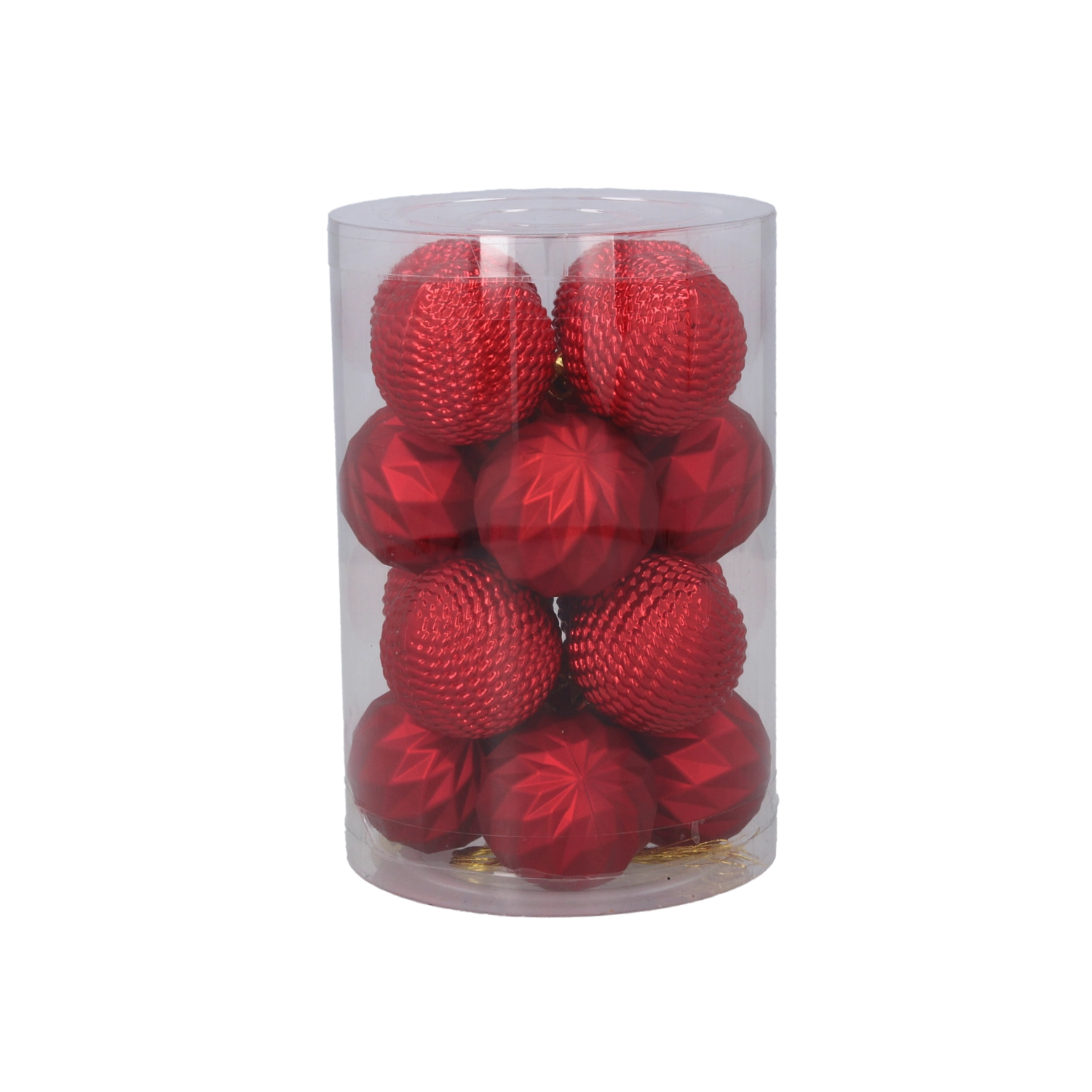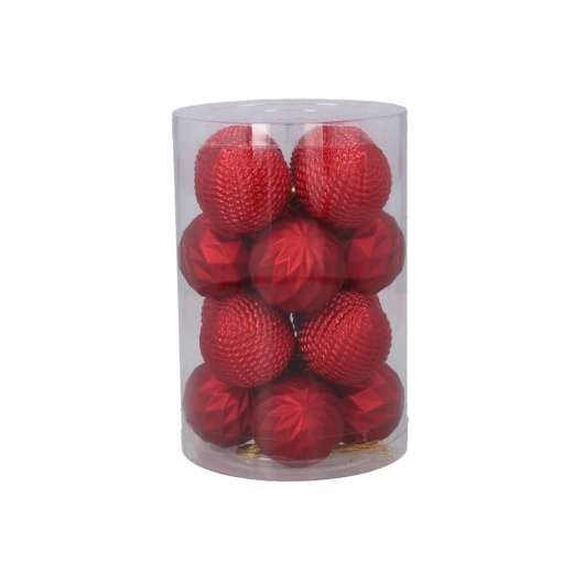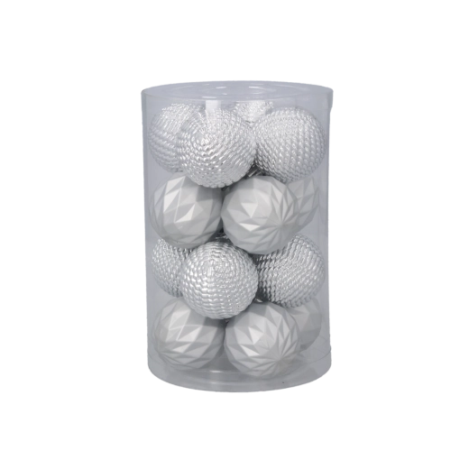 Elegant sæt med 16 juleornamenter med en diameter på 4 cm i en kombination af rød, guld og sølv, som giver træet et traditionelt og festligt udseende. Pynten er lavet af splintsikkert materiale og er sikker, let og holdbar. Den praktiske emballage i en gennemsigtig tube gør det nemt at opbevare og transportere.