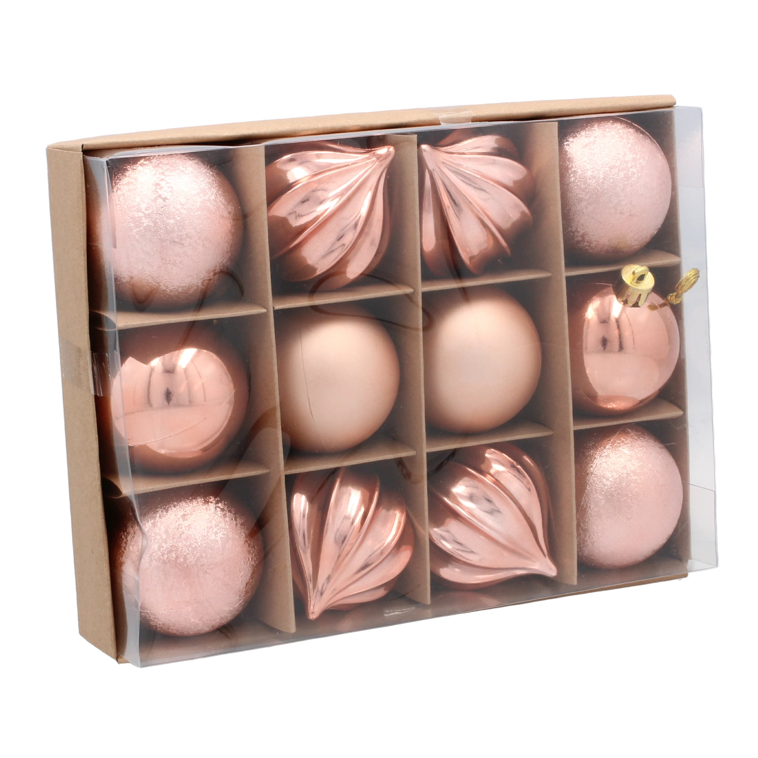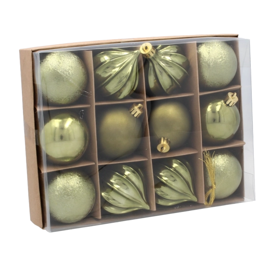 Elegant sæt med 12 juleornamenter med en diameter på 6 cm i en kombination af oliven-, kobber- og grafitfarve, der giver træet et moderne og sofistikeret udtryk. Det lette og holdbare plast er ideelt til hjem med børn og kæledyr, og de forskellige dekorative mønstre skaber en unik charme.