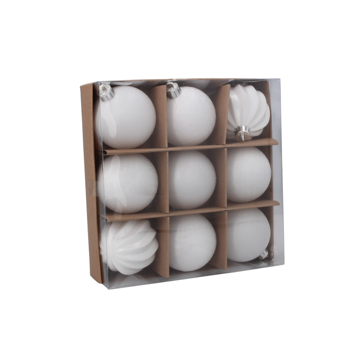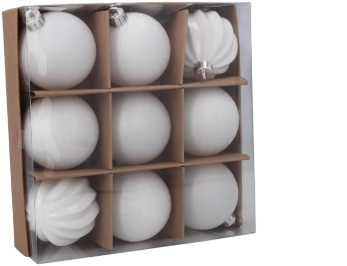 Pakken indeholder 9 styk for jævn placering på et mellemstort træ. Den ensartede hvide farve gør det let at matche med anden dekoration, lyskæder og bånd. Også ideel til DIY – du kan tilføje glitter, bånd eller påskrifter.