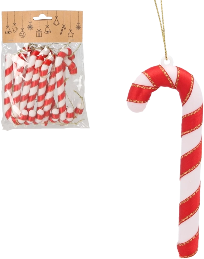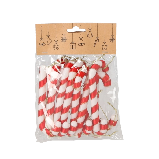 Den traditionelle dekoration i form af sukkerstokke hører julen til lige så meget som lys og duften af småkager. Dette sæt med 12 stk. i rød-hvid kombinerer et klassisk udtryk med en praktisk udførelse – det robuste plast er let, sikkert og ideelt til familier med børn og kæledyr.