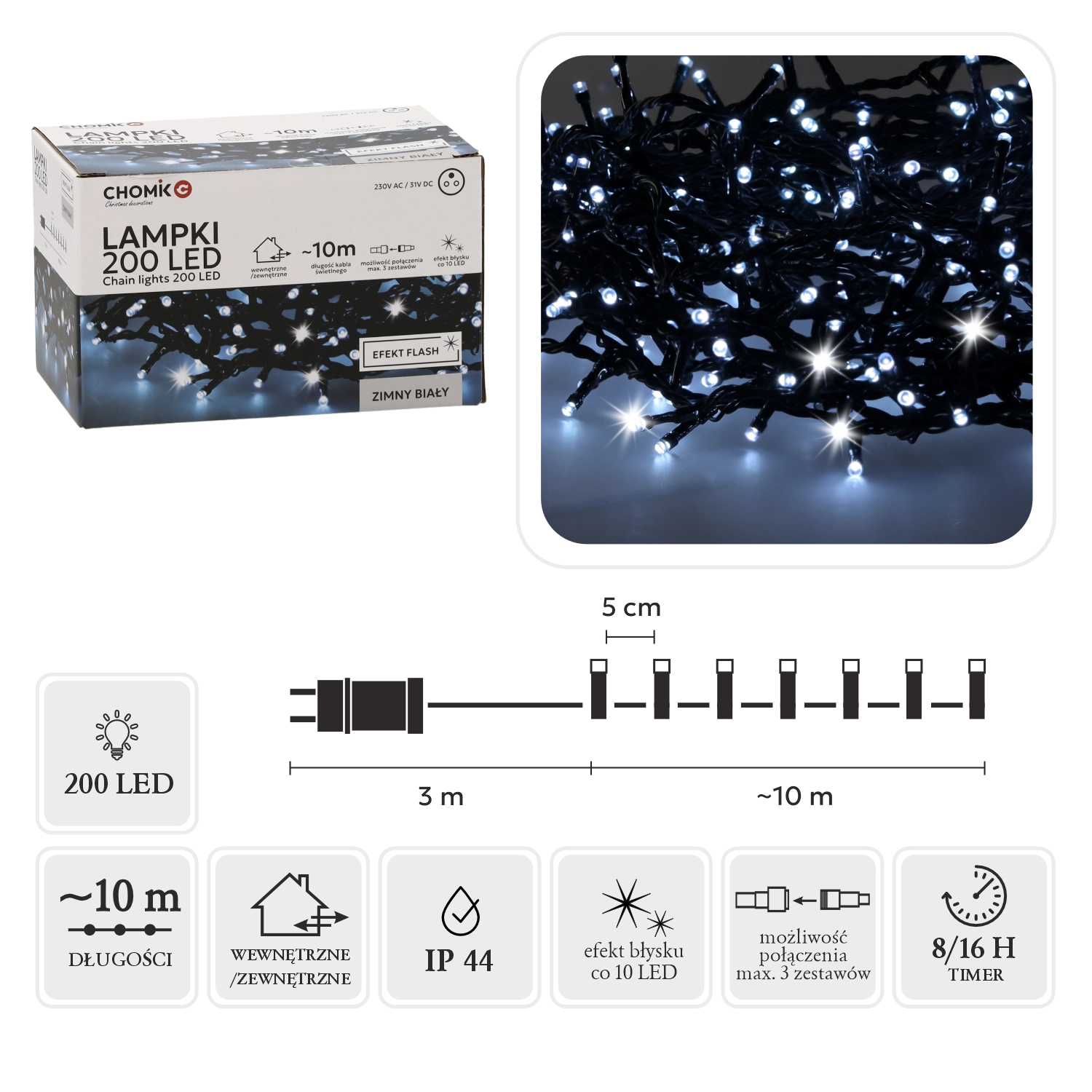 Stilfuld lyskæde med 200 LED i kold hvid og kold flash-effekt, som oplyser både hjem og have. Tilbyder 10 m lysende del + 3 m tilslutningskabel, programmering med hukommelse og timer 8/16 t, tilstande kontinuerligt lys + flash og IP44 for sikker brug ude og inde.