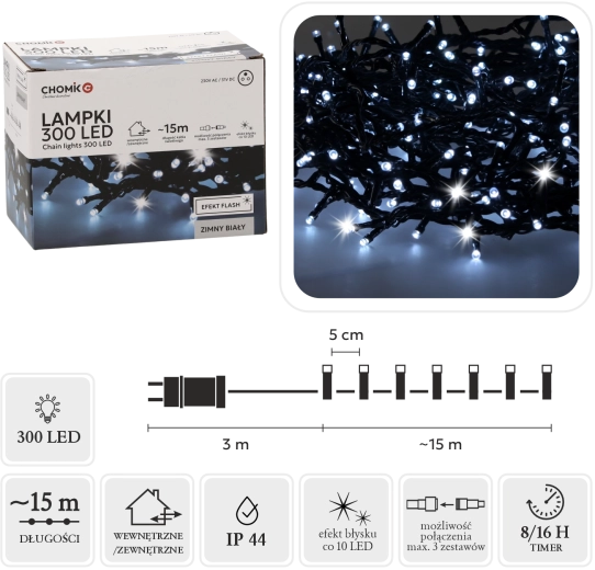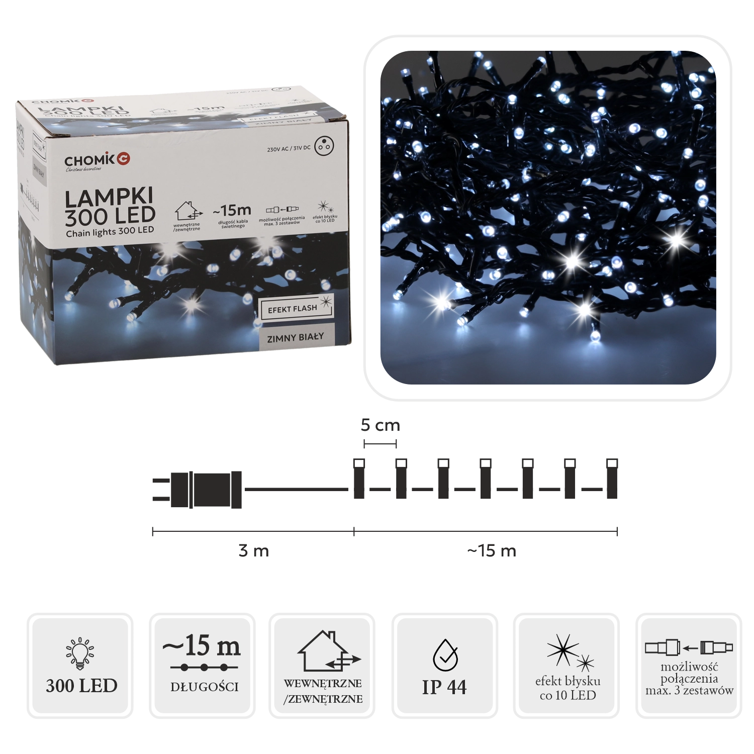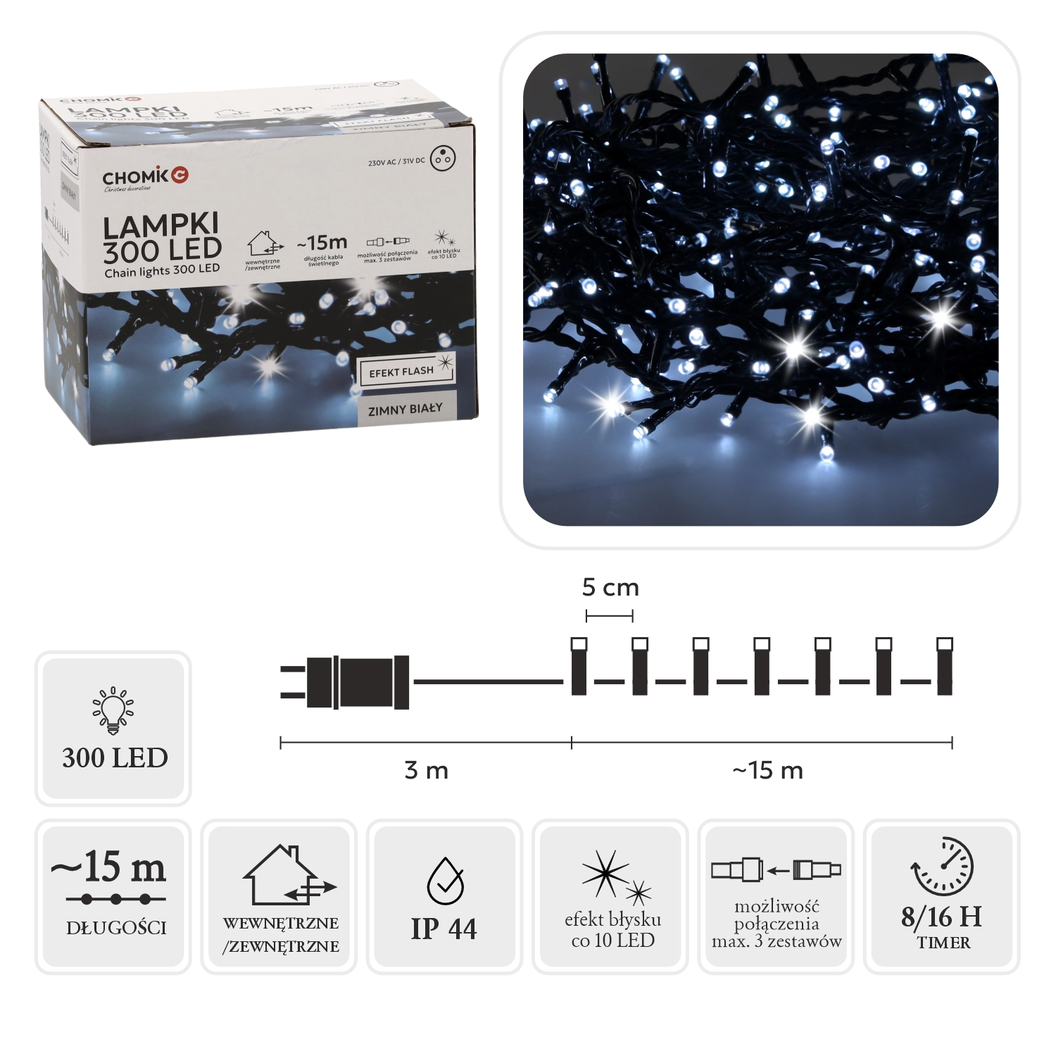 Skab en festlig stemning med en LED-lyskæde på op til 18 m med 300 dioder i kold hvid suppleret med flash-effekt. Kæden tilbyder konstant lys og blink, programmer med hukommelse og timer 8/16 t, er velegnet til både indendørs og udendørs brug (IP44), og takket være grøn isolering falder den diskret ind blandt grenene på træer.