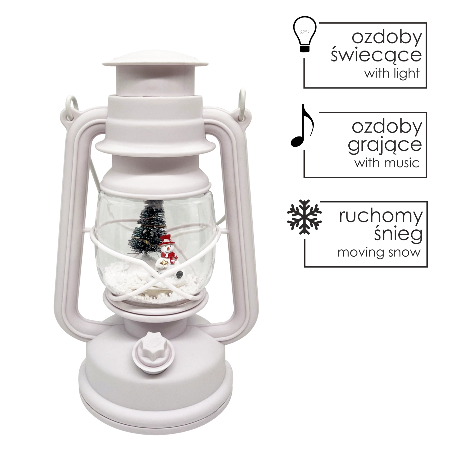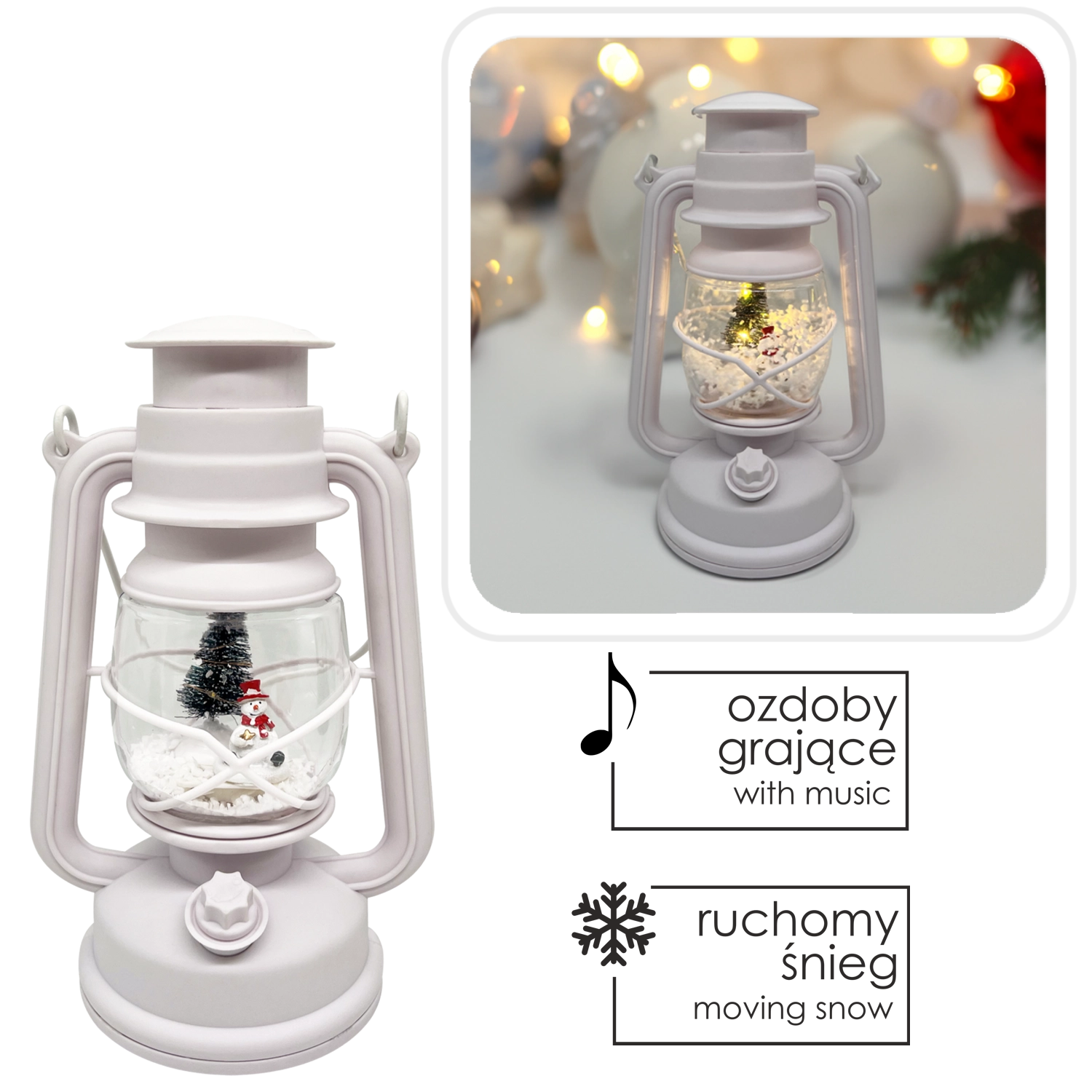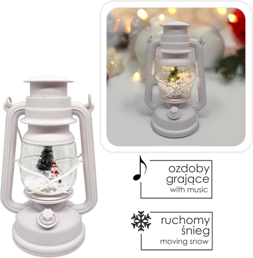 Elegant julelanterne med motiv af en snemand og et træ, som bringer en magisk højtidelig stemning ind i dit hjem. Takket være varm LED-belysning og en indbygget spilledåse skaber den en behagelig, hyggelig atmosfære til vinteraftener. Den alsidige størrelse er ideel til bord, hylde eller vindueskarm og fuldender din pynt med et stilfuldt og funktionelt element.
