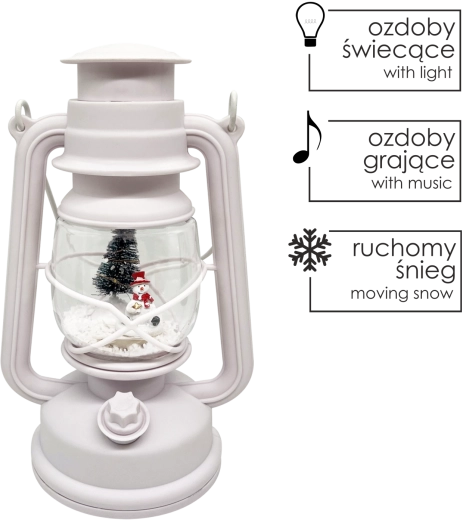 Forkæl din indretning med julestemning med den hvide CHOMIK-lanterne, der kombinerer dekorativt udtryk med praktiske funktioner. Den indbyggede LED-belysning giver et blødt og energieffektivt lys, mens spilledåsen understreger højtiden med en behagelig melodi. Motivet med den charmerende snemand ved træet vil glæde både børn og voksne.