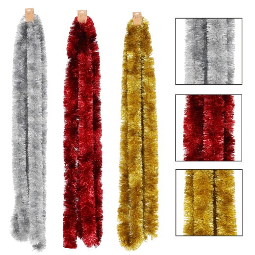 Pynt dit hjem med stil – denne 6 meter lange juleguirlande i en kombination af rød, guld og sølv giver din udsmykning et klassisk og elegant udtryk. Den er fremstillet af let plast for nem håndtering, og dens skinnende overflade reflekterer lyset smukt og skaber en magisk, festlig atmosfære.