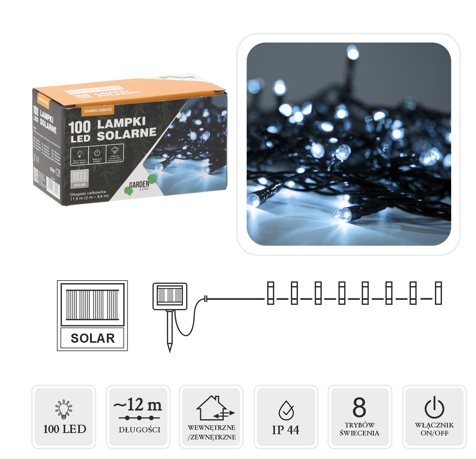 Solcelledrevet LED lyskæde med 100 kolde hvide LED uden behov for tilslutning til elnettet. Oplyst længde 10 m, tilledning 2 m, i alt 12 m. Timer med 8 funktioner, IP44-beskyttelse til udendørs brug og energibesparende drift via solpanel. Den grønne kabel farve går i ét med buske, hegn eller pergola.