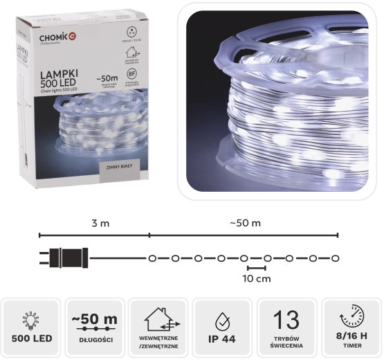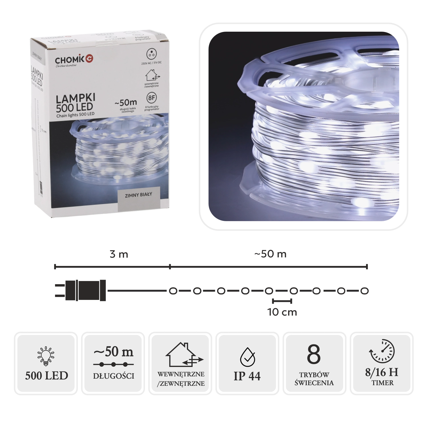 Pynt dit hjem med strålende lys med denne LED mikrokæde på 50 m i koldt hvidt lys og 500 LED. Den tilbyder 8 lysfunktioner med hukommelse og timer 8/16 t, IP44 til udendørs og indendørs brug, gennemsigtig isolation og sikker strømforsyning 31 V med 3 m tilledningskabel.