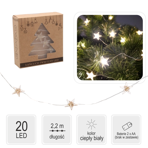 Lyskæde LED stjerner 20 lys på batteri med gylden pynt