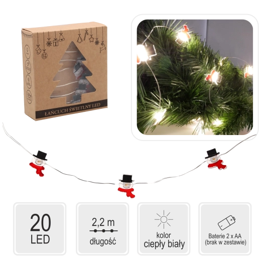 Denne dekorative lyskæde bringer en fortryllende, festlig atmosfære ind i rummet. Hver diode er udsmykket med et snemandstema, som skaber en hyggelig, varm glød og lyser børneværelser, stuer og festlige arrangementer op. Takket være 2× AA-strøm er du ikke bundet til en stikkontakt – ideelt til steder, hvor du ikke ønsker synlige kabler.