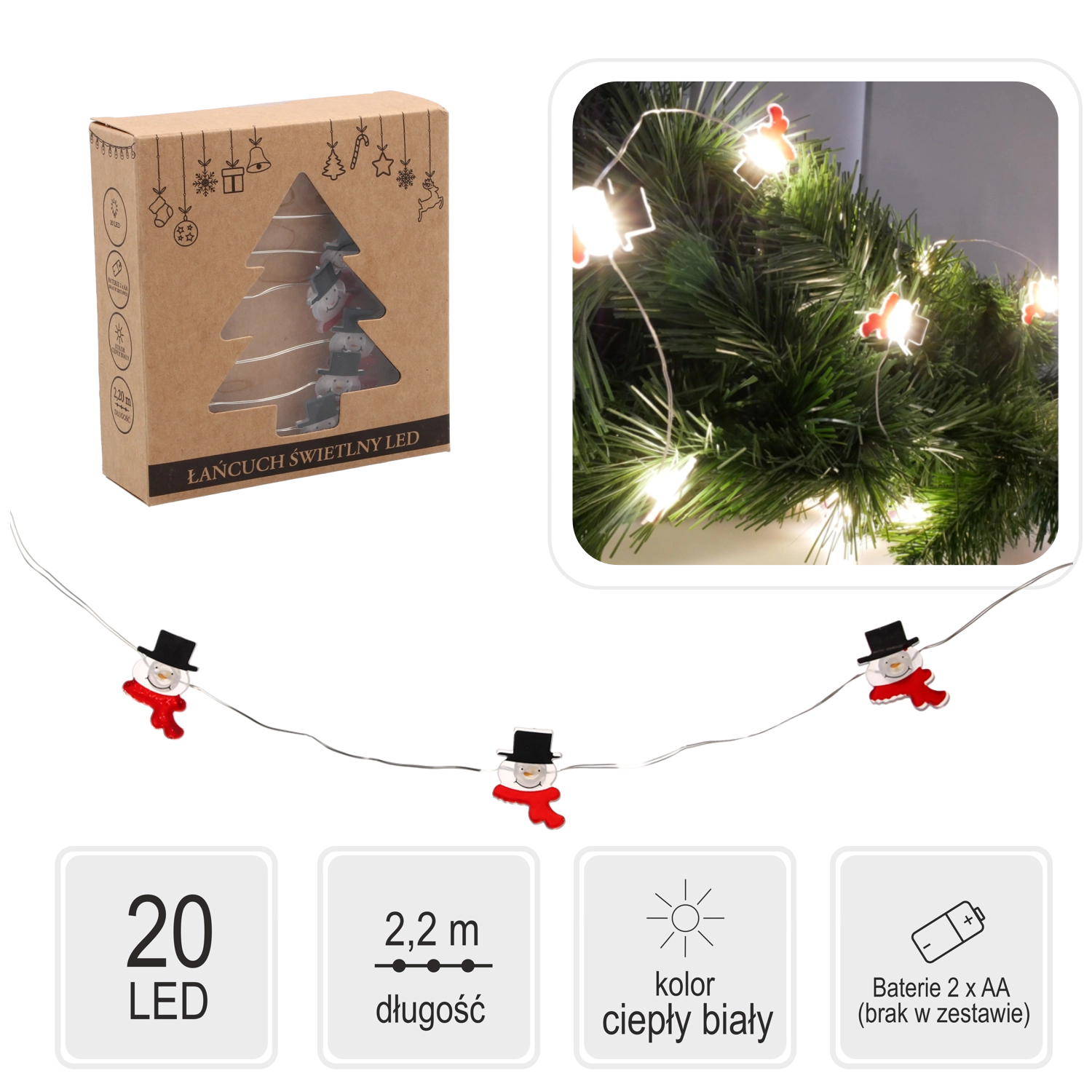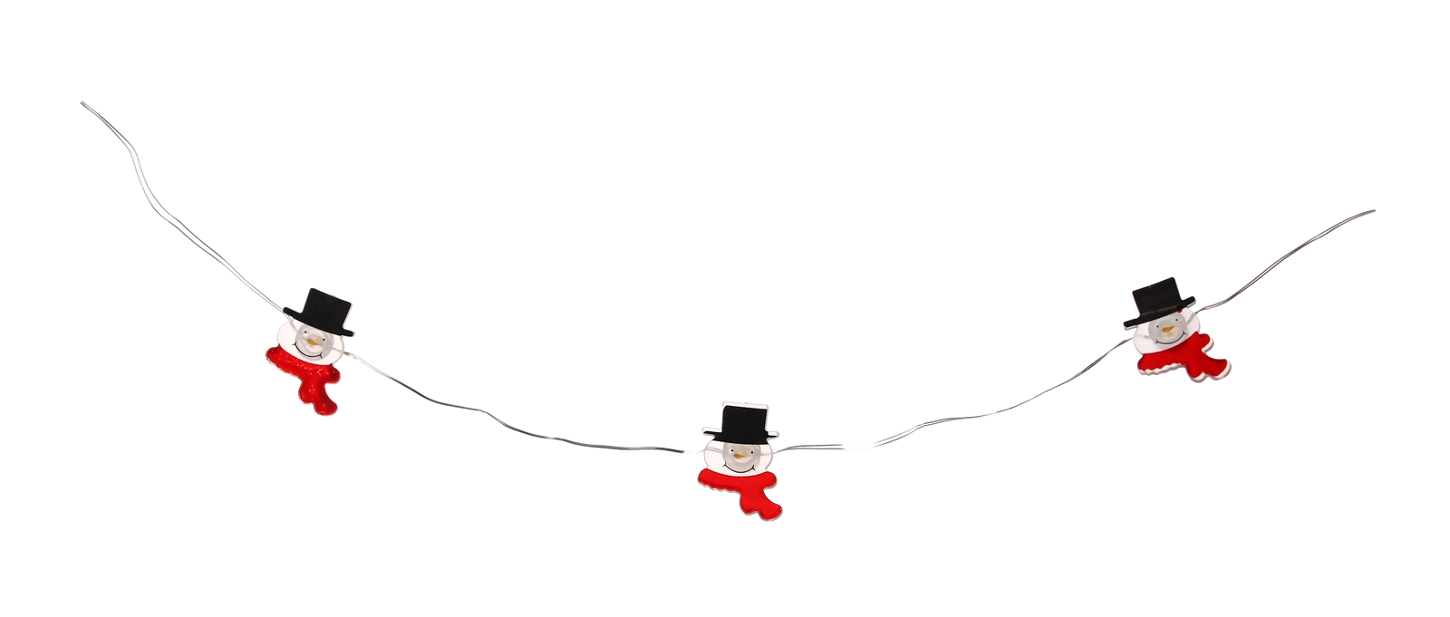 Lys de vinterlige aftener op med en legende lyskæde med snemænd. Den byder på 20 varmhvide LED på en gennemsigtig ledning, batteridrift for fri placering uden stikkontakt og dekorationslys ideelt til juletræet, vindueskarmen eller kransen.