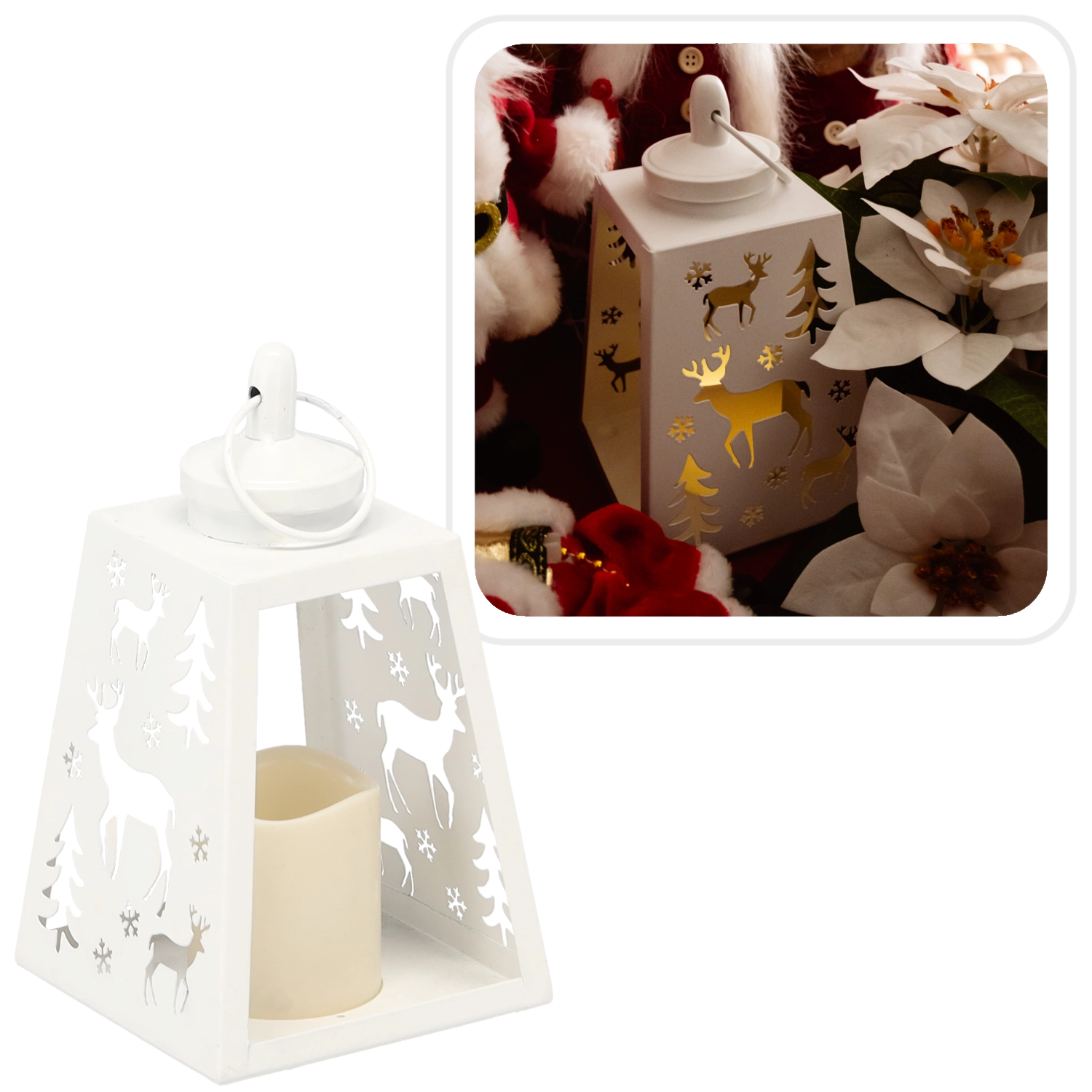 LED lanterne i hvidt metal med rensdyrmotiv 12 × 21,5 cm