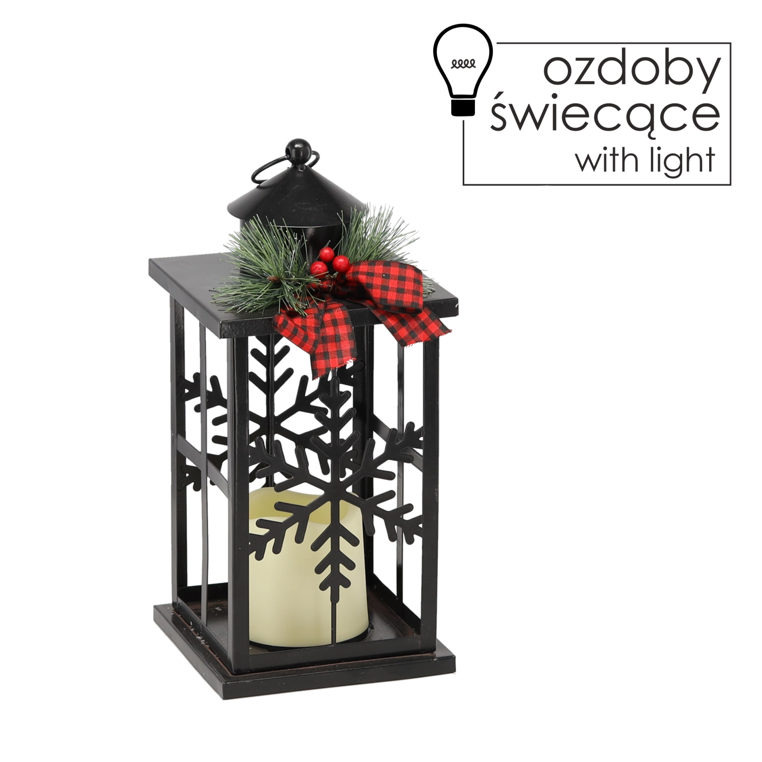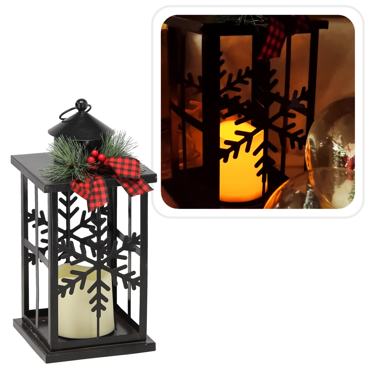 Elegant julelanterne i sort metal, der bringer hyggeligt lys og festlig stemning til dit hjem. Dekorationen prydes af fine motiver af snefnug, en stilfuld sløjfe og varmt LED-lys, som er sikkert og energibesparende. Ideel som dekoration på bord, kommode eller vindueskarm.