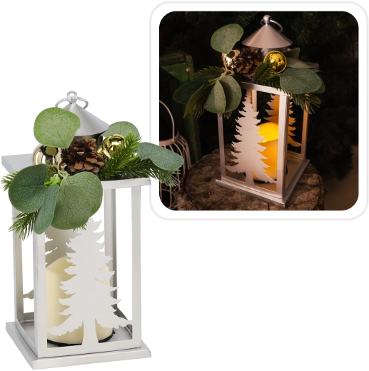 Elegant julelanterne i sølv, der oplyser dit hjem med et behageligt lys. Den metaliske krop med dekorative motiver af små træer suppleres af pynt med grønne kviste og en koglen. Indeni er der et sikkert LED-lys, så du kan nyde en magisk atmosfære uden røg og åben ild.