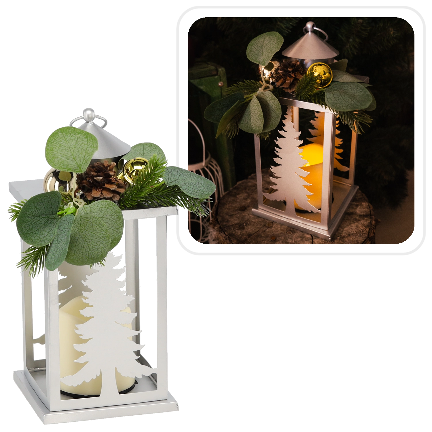 Skab en festlig stemning derhjemme med denne stilfulde lanterne i sølvfarve. Den kombinerer det klassiske look fra en metallygte med moderne og sikker LED-belysning. De dekorative elementer i form af små træer, grønne kviste og en koglen giver interiøret hygge og vintermagi.