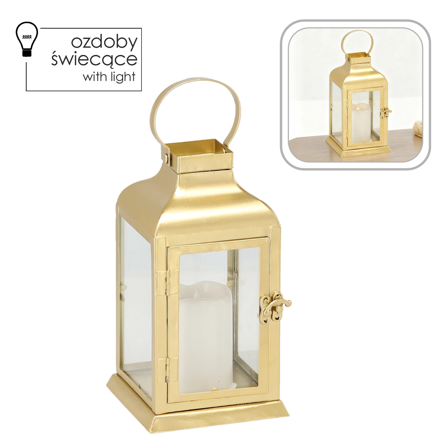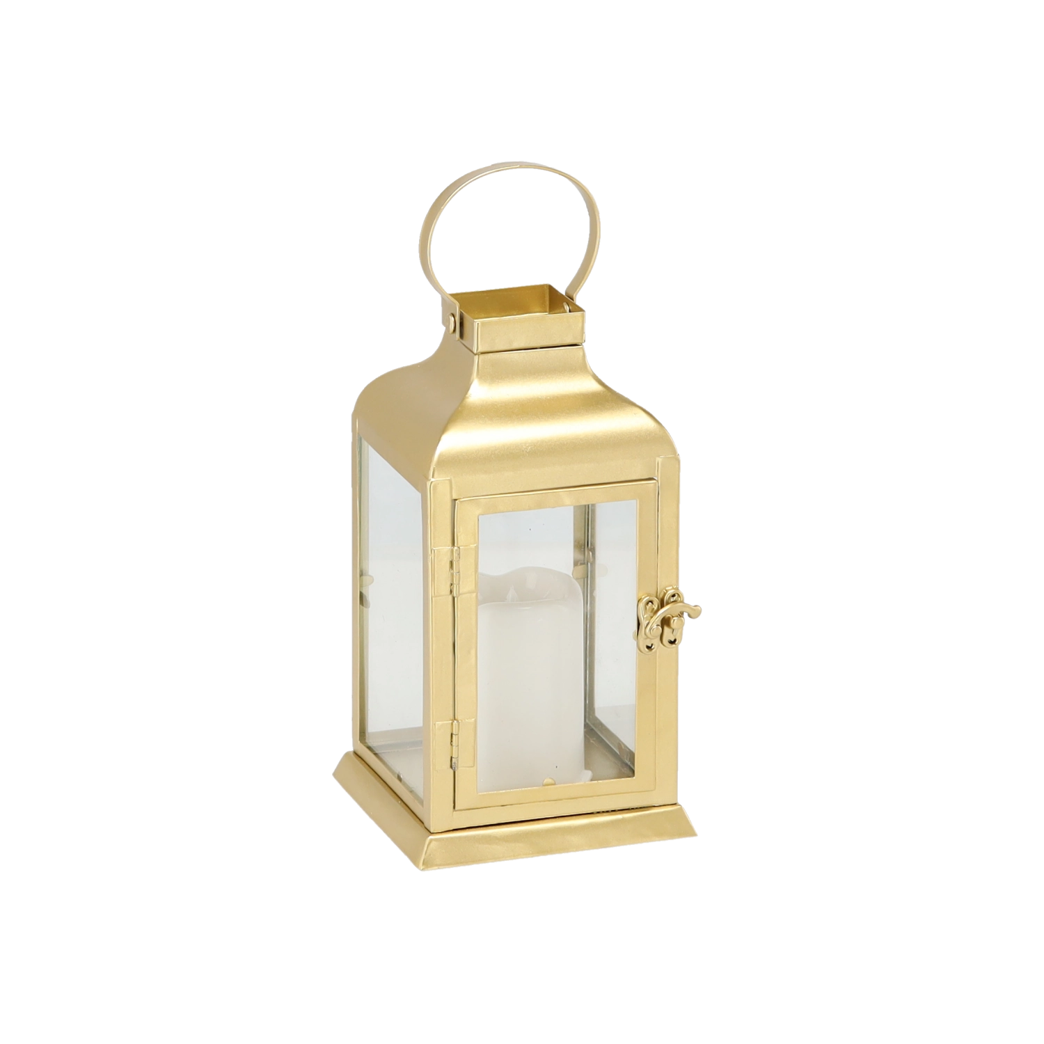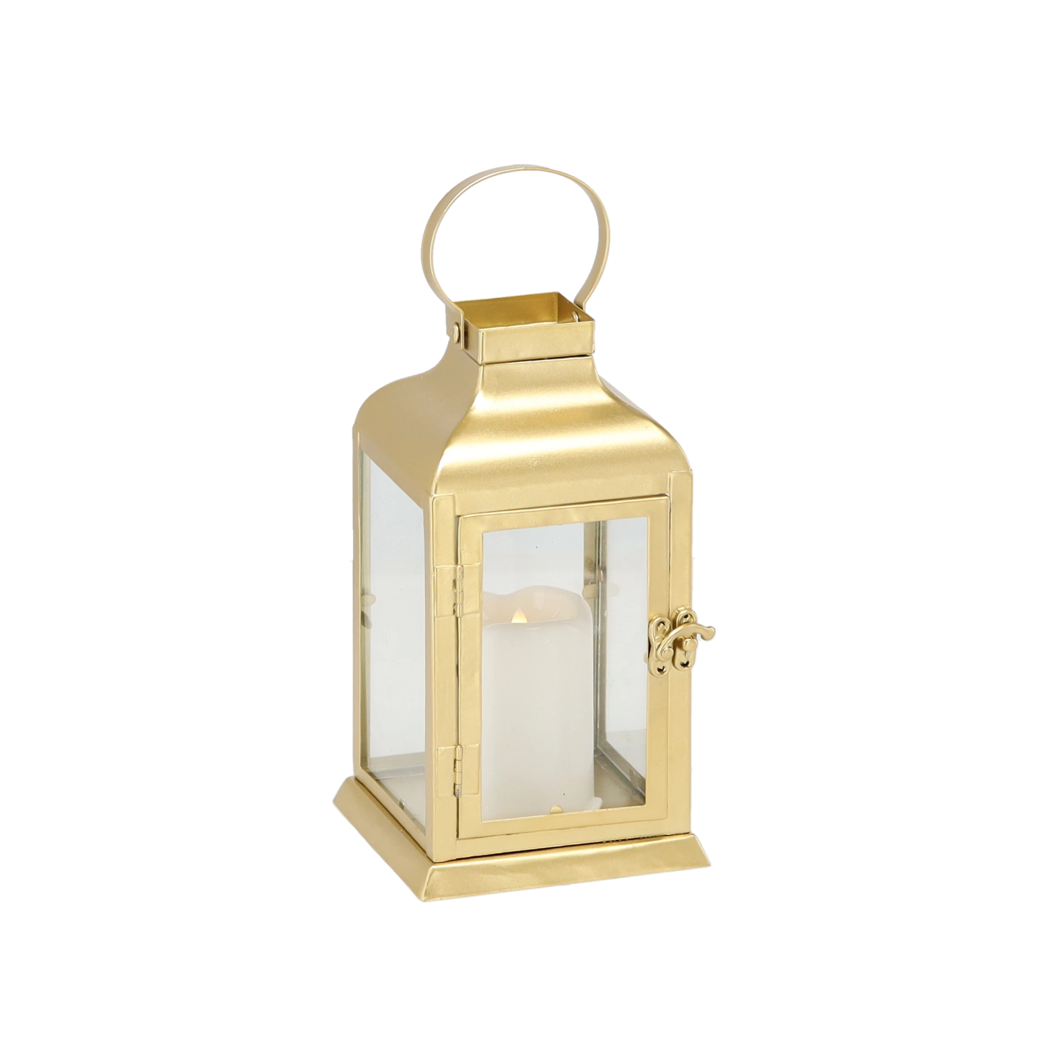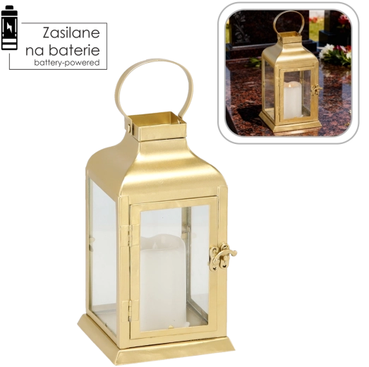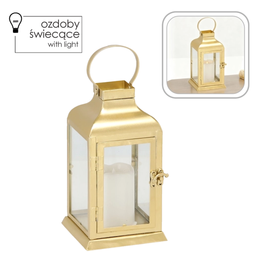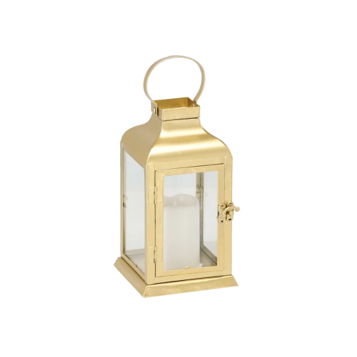 Den elegante guldfarvede lanterne kombinerer en tidløs metalramme med klare glaspaneler og et sikkert LED “lys”. Den giver et varmt, flimrende skær uden risiko for åben flamme – perfekt til stue, gang, altan eller det festlige middagsbord.