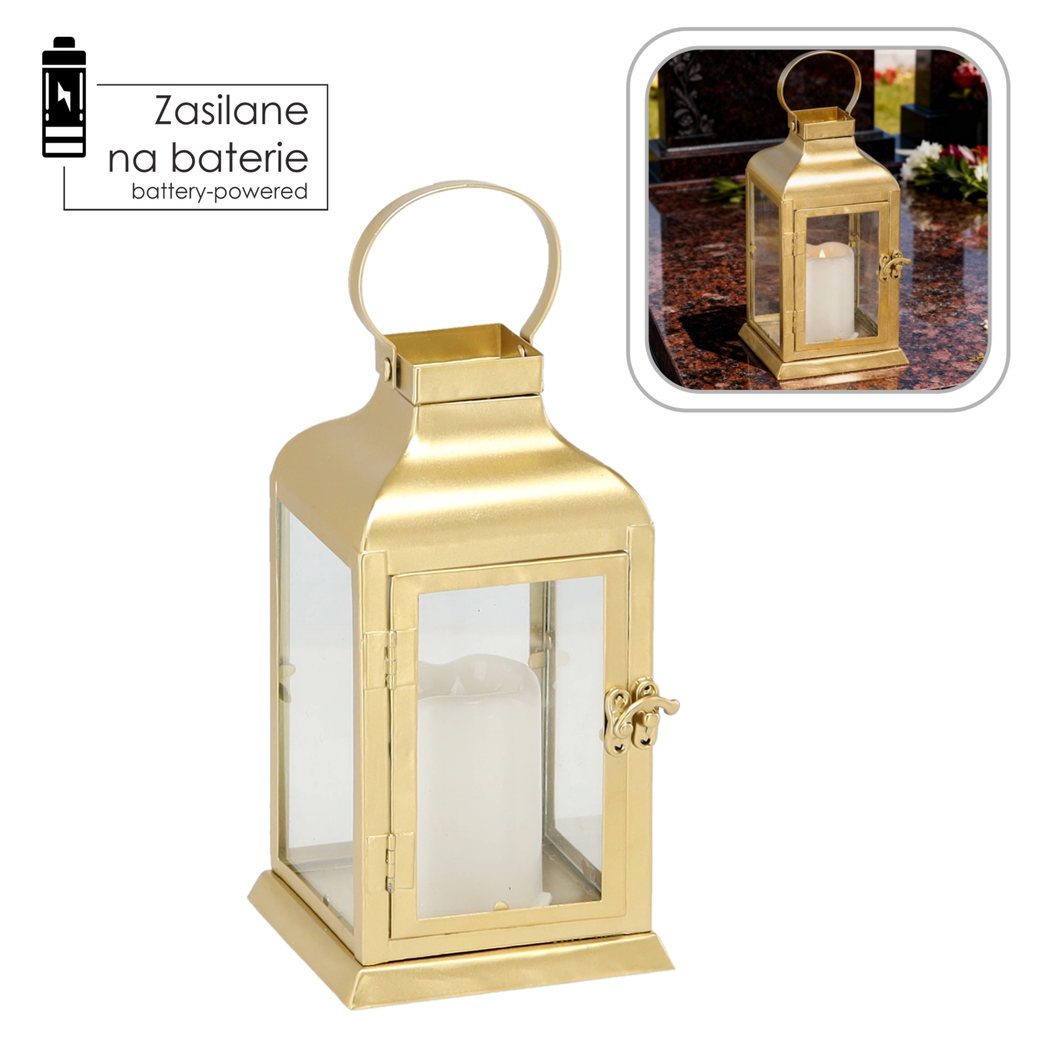 Takket være det praktiske håndtag kan den nemt bæres eller hænges op. Dør med lås gør adgangen enkel, mens den solide base holder lanternen stabil. Drives af 3× AAA-batterier (medfølger ikke), hvilket giver fleksibel brug uden kabler.