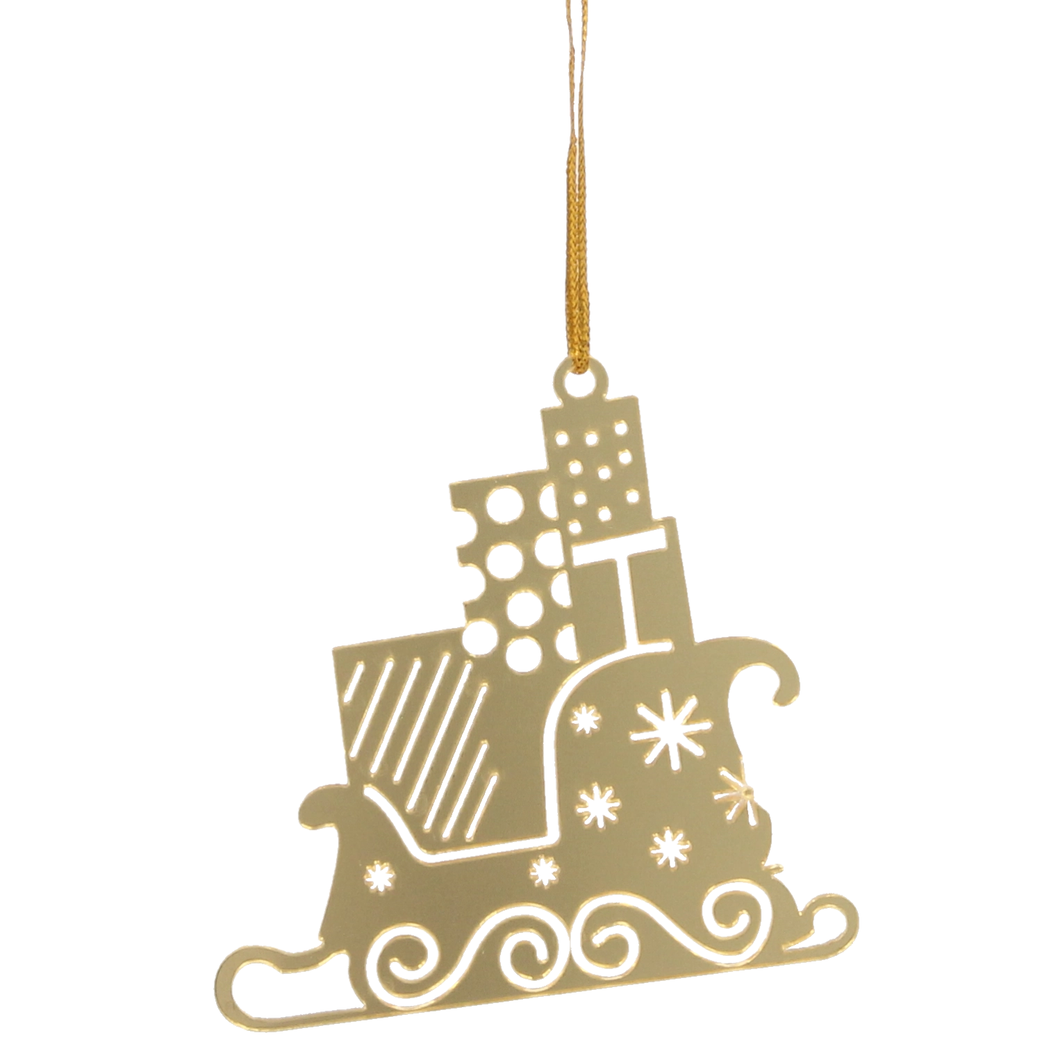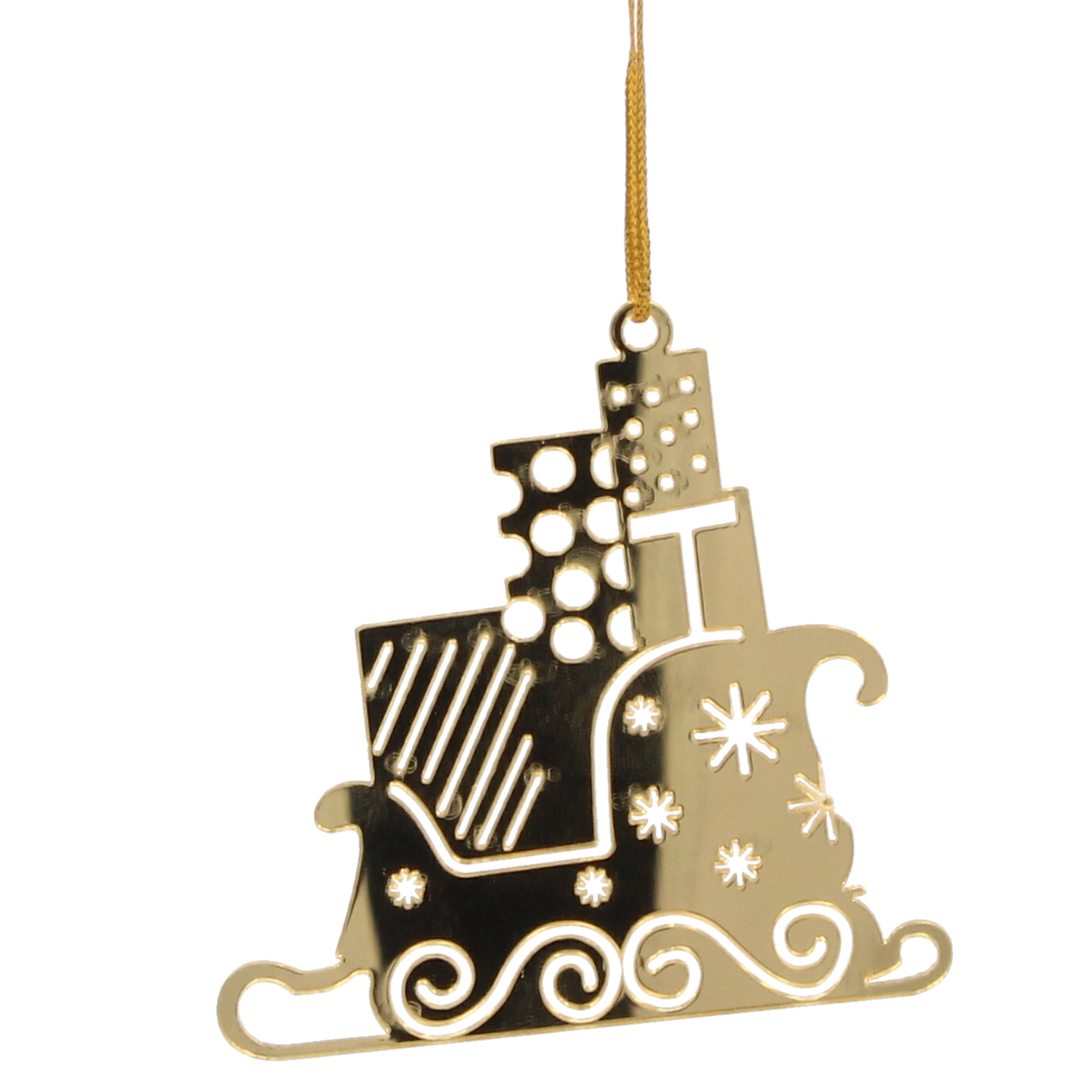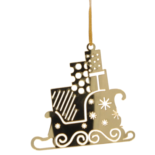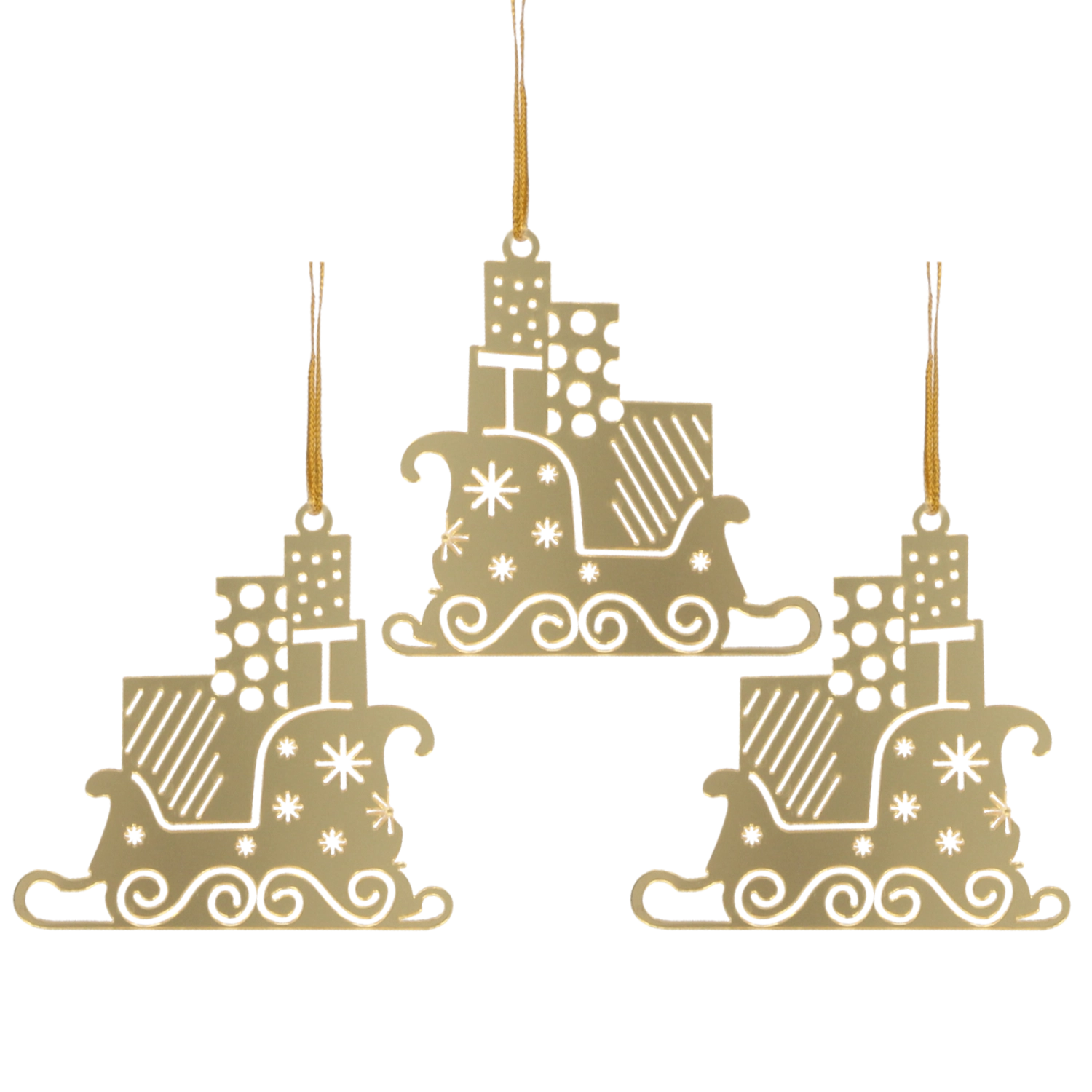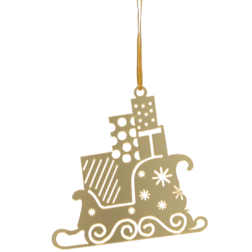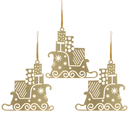 Imponér dine nærmeste med stilfuld juleudsmykning. Sættet med tre gyldne pynt i form af Santa Claus’ slæde bringer festlig glans og elegance til indretningen. Det lette materiale gør dem nemme at håndtere, mens den præcise udførelse sikrer lang holdbarhed, så du kan nyde dem sæson efter sæson.