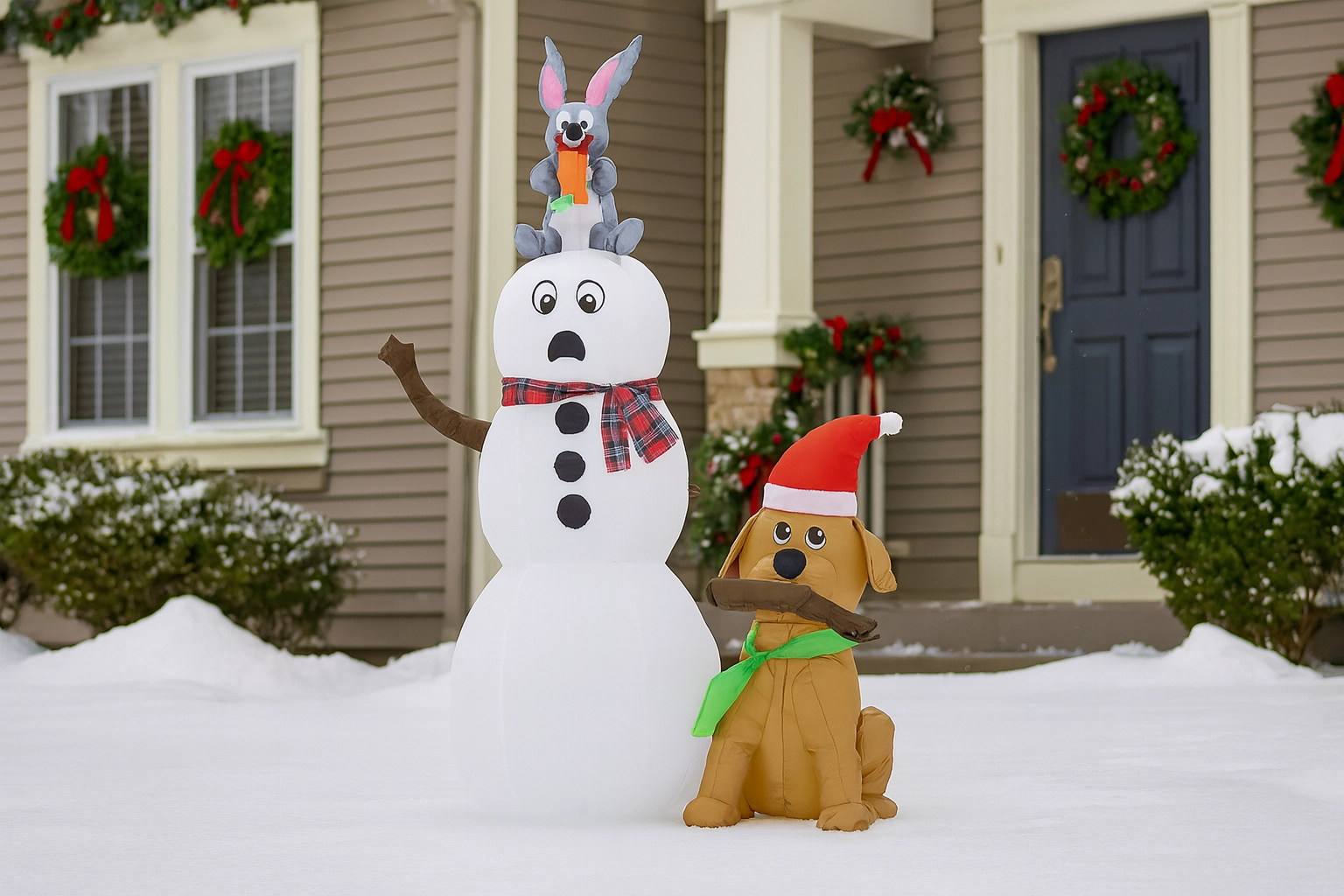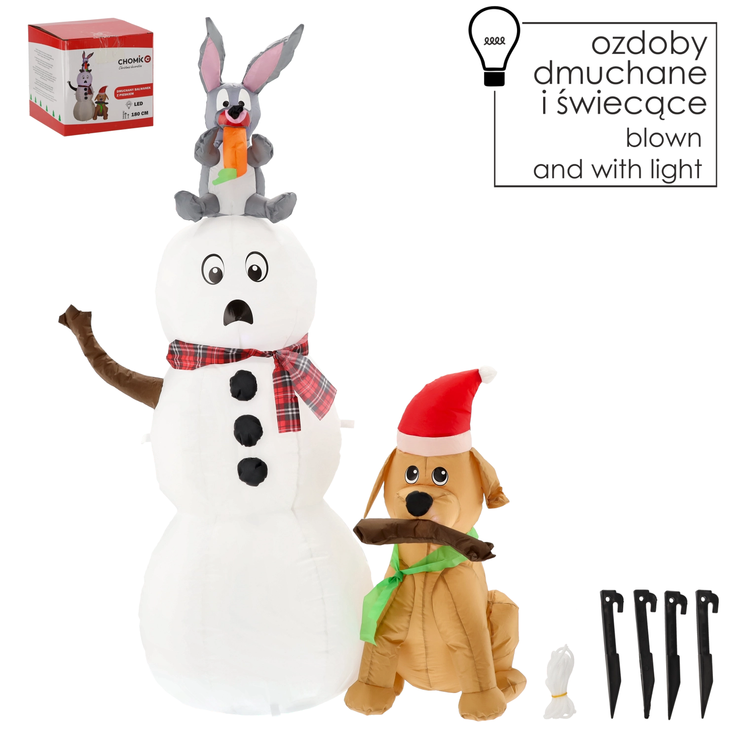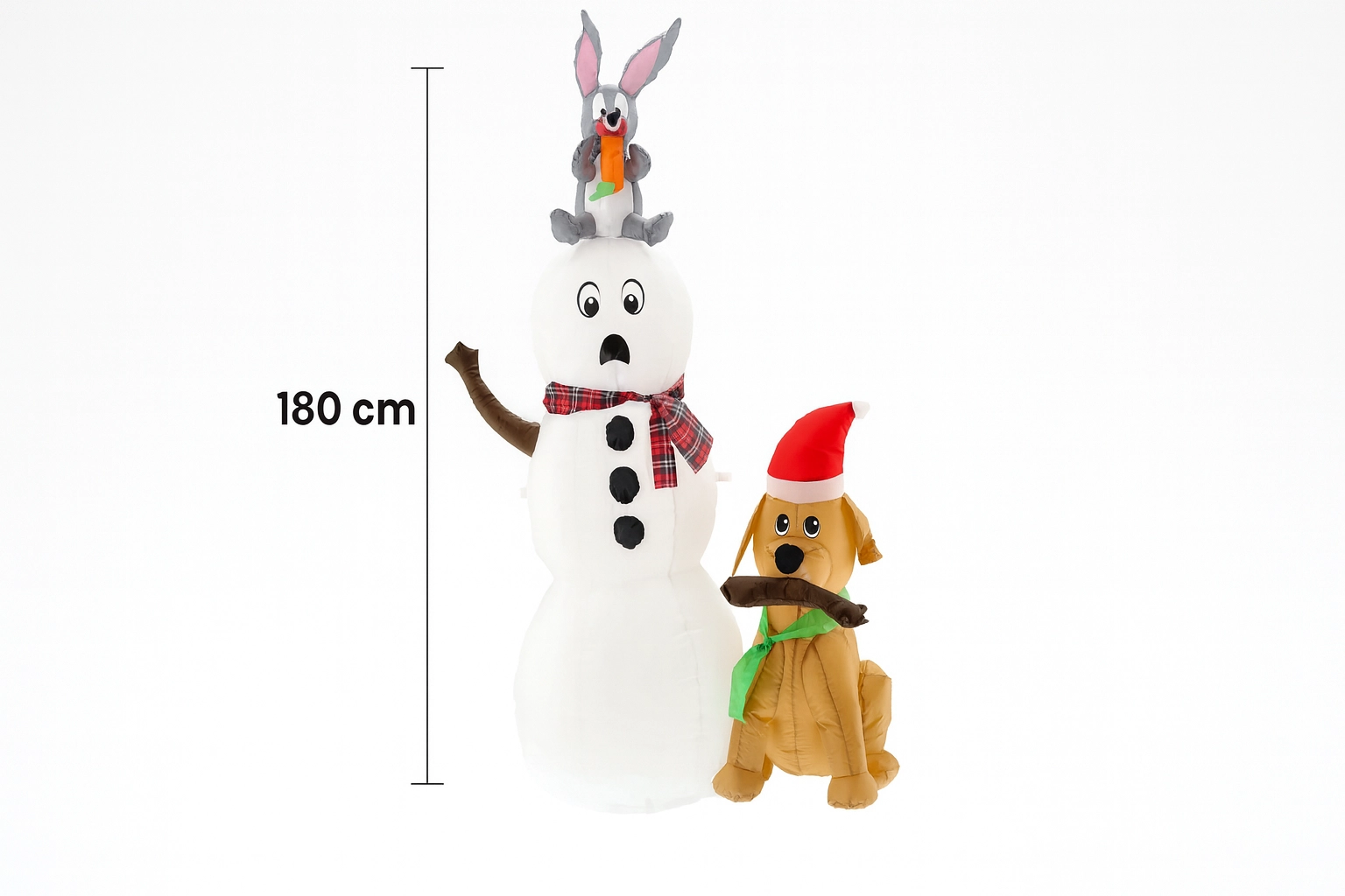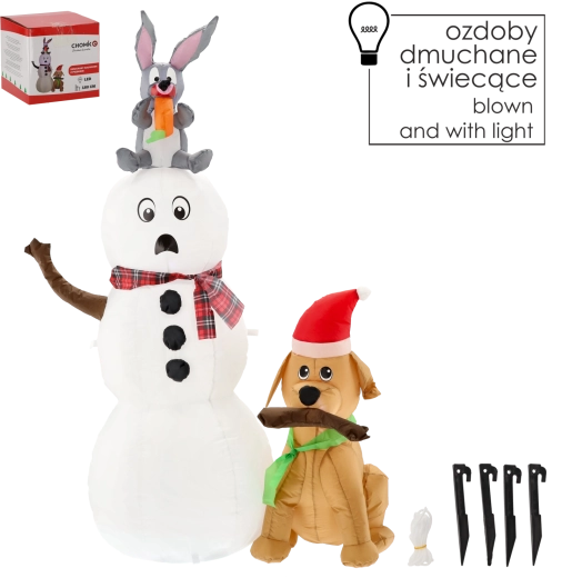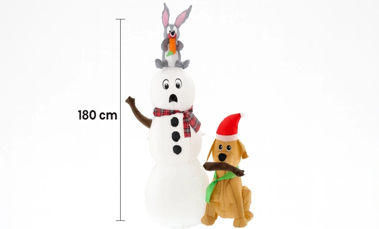 Bring julemagien ind i dit hjem og din have med denne søde oppustelige snemand med en hund og en kanin. Takket være integreret LED-belysning, en højde på 180 cm og nem installation skaber den på få øjeblikke en eventyrlig stemning, synlig på lang afstand – ideel til både indendørs og udendørs brug.