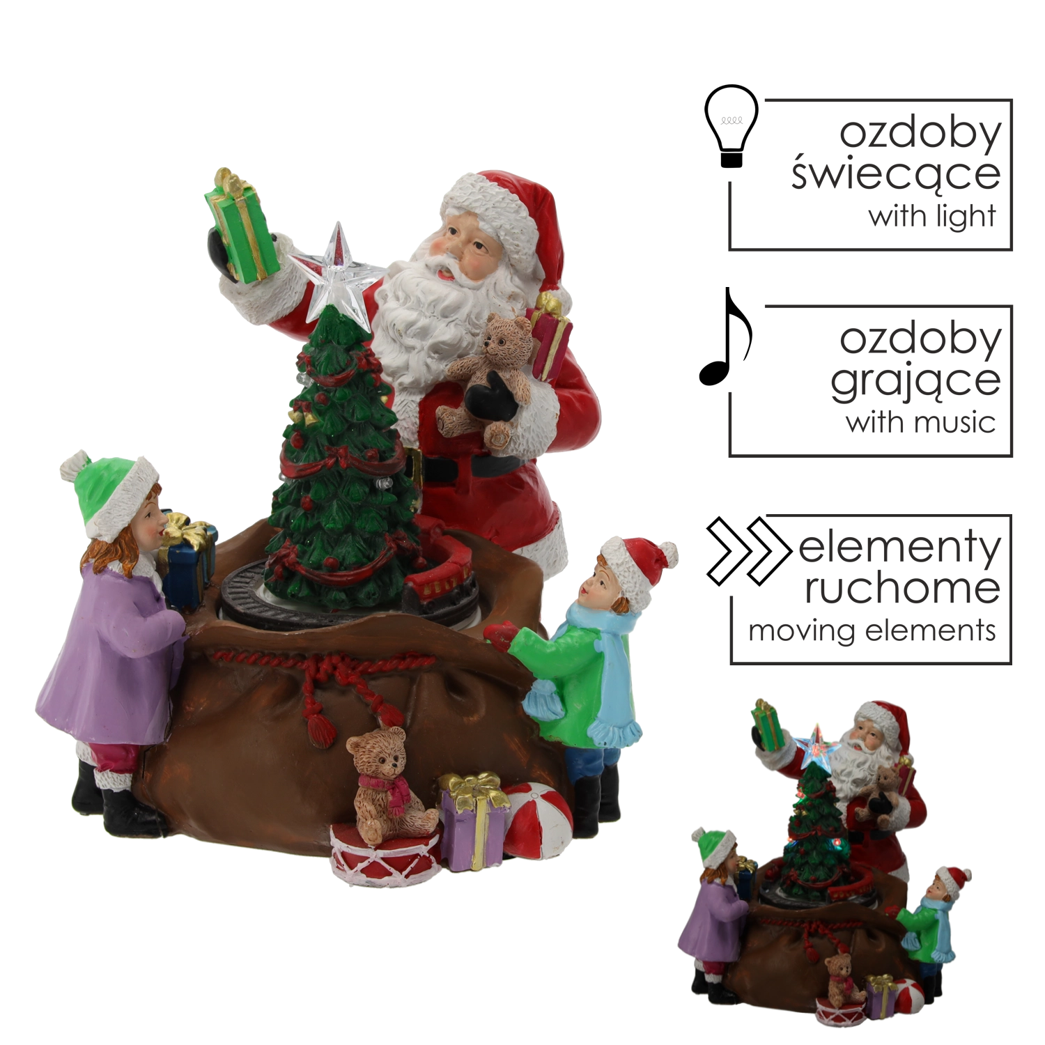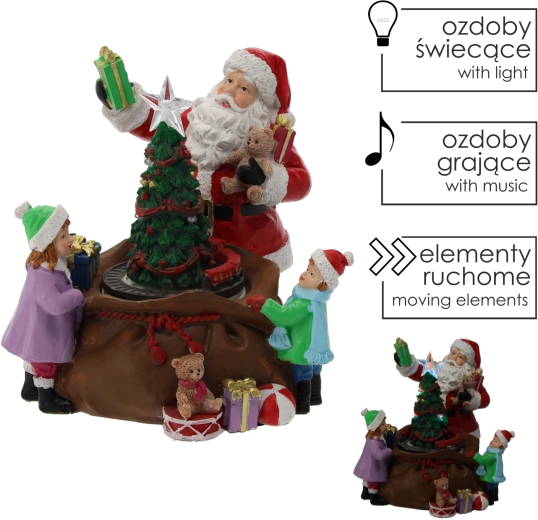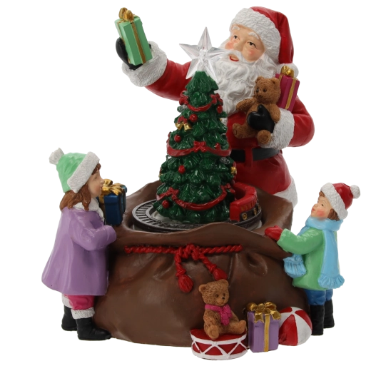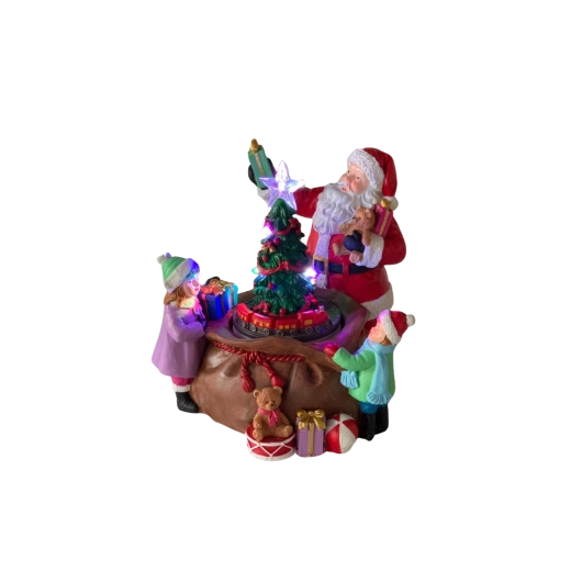 Denne detaljerede juledekoration med figur af JULEMANDEN, børn og gavmild gaveuddeling omkring det oplyste træ forvandler enhver indretning til et hyggeligt, festligt hjørne. Integrerede LED-dioder inklusive en strålende stjerne i toppen af træet og farvede lys skaber en varm, højtidelig stemning.