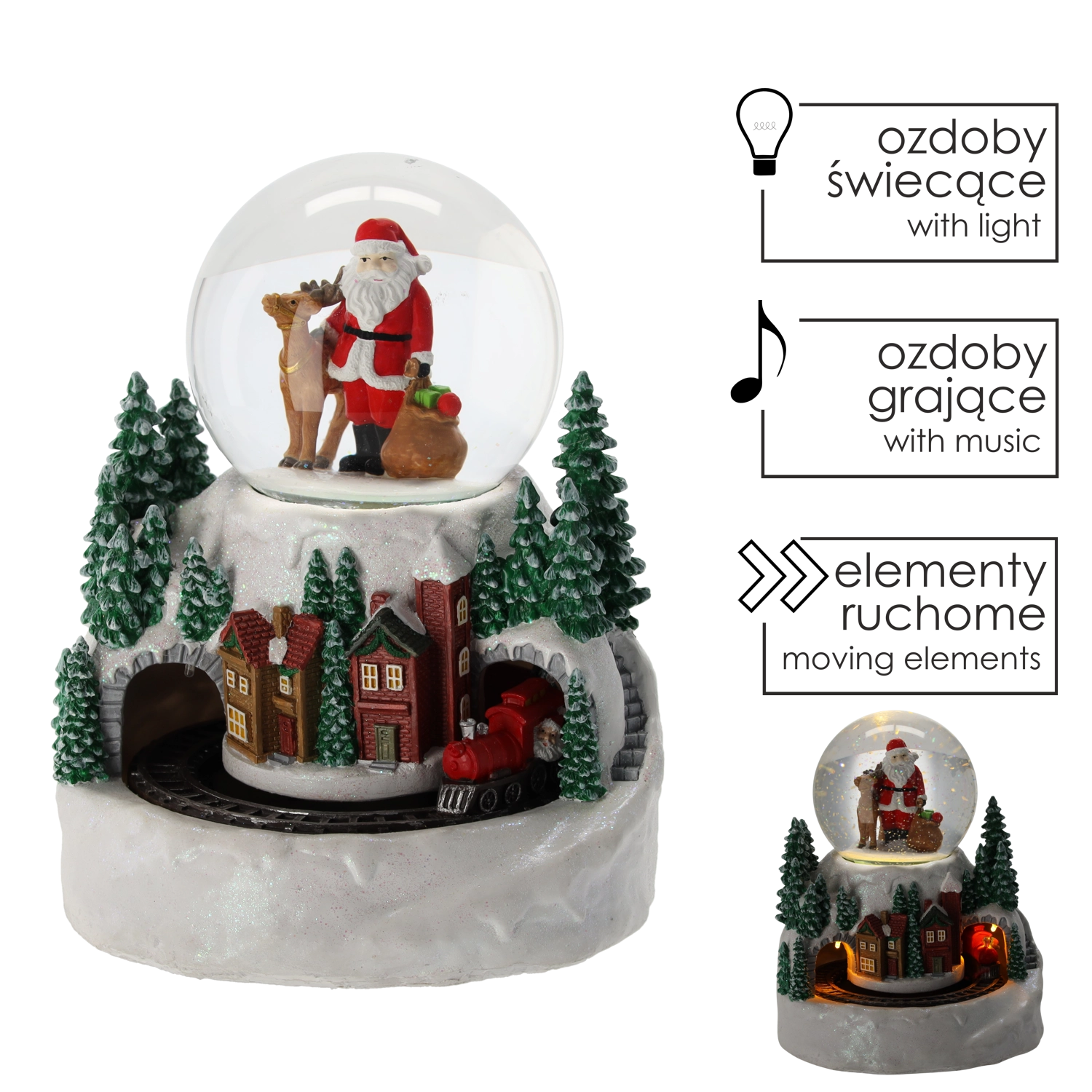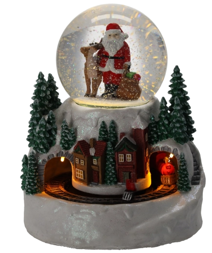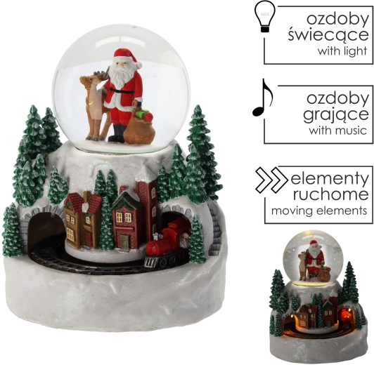 Denne detaljerede snemmekugle med motiv af JULEMANDEN og en vinterlandsby vil begejstre både voksne og børn. Det integrerede LED-lys giver en varm glød, mens et mini-tog kører rundt om basen og giver scenen liv. Dekorationen tilbyder 3 driftstilstande, så du kan nyde lys og bevægelse med musik eller i en stille tilstand.