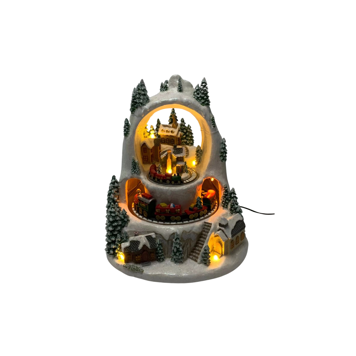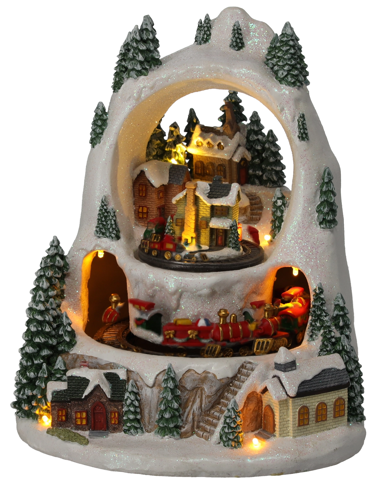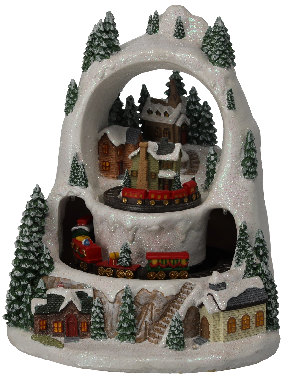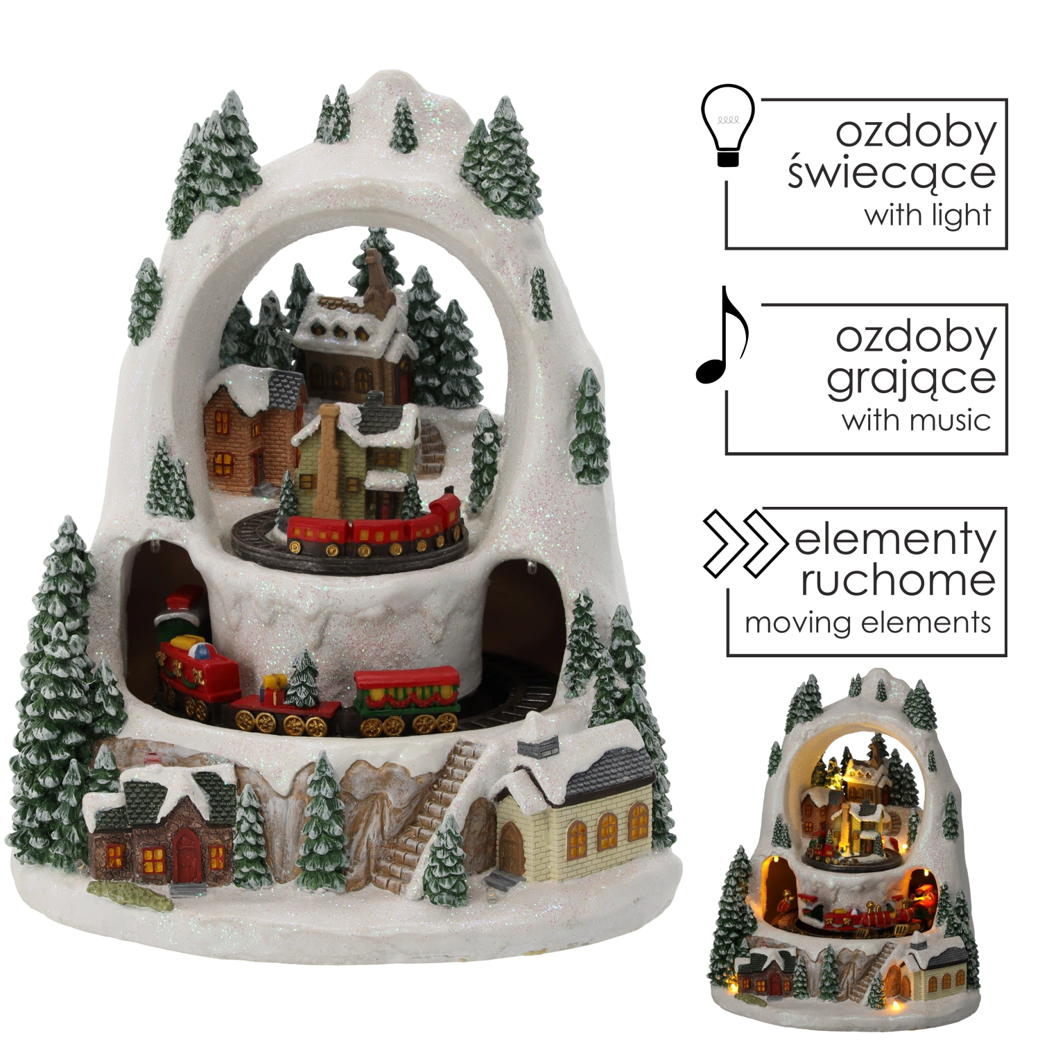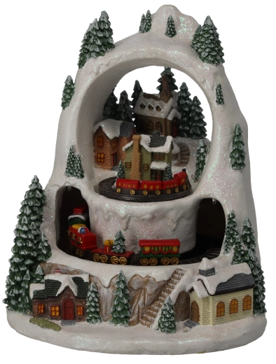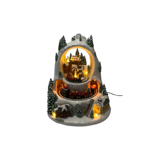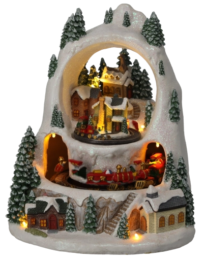 Skab et lille vintermirakel derhjemme. Den detaljerede julelandsby med snedækkede huse og træer vækkes til live af togturen på to niveauer, det behageligt varme LED-lys og muligheden for at afspille klassiske højtidsmelodier. Vælg mellem tilstand med lyd eller stille drift kun med lys og animation.