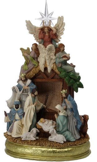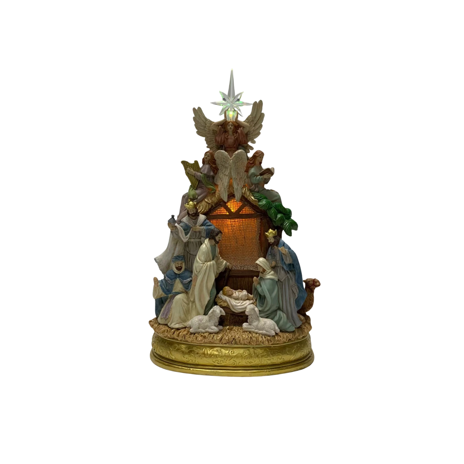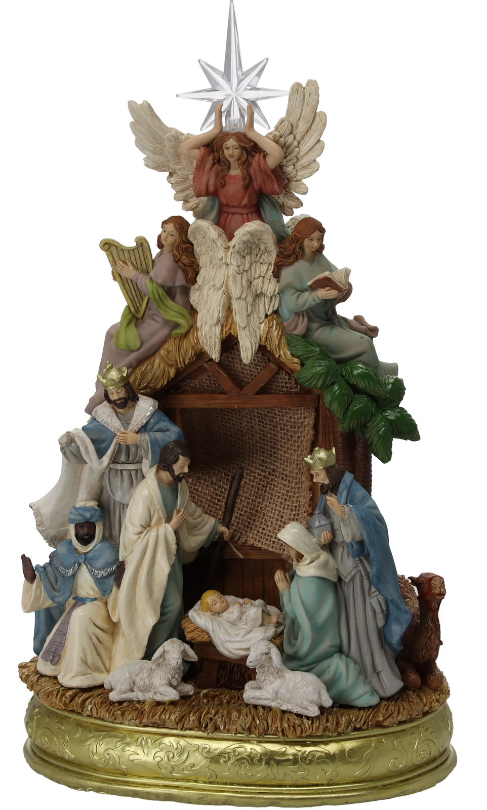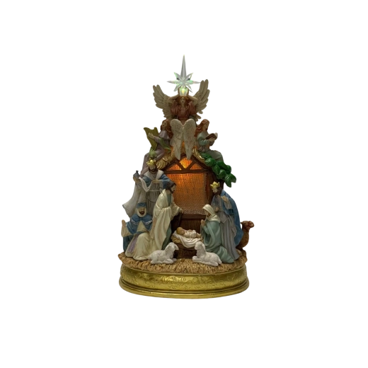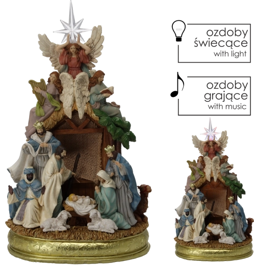Denne dekorative krybbescene i harpiks imponerer med detaljerede figurer af den Hellige Familie, engle, hyrder og De Tre Vise Mænd. Den integrerede LED-belysning oplyser stalden med et behageligt, varmt lys, mens julestjernen pulserer i farver og forstærker den festlige stemning.